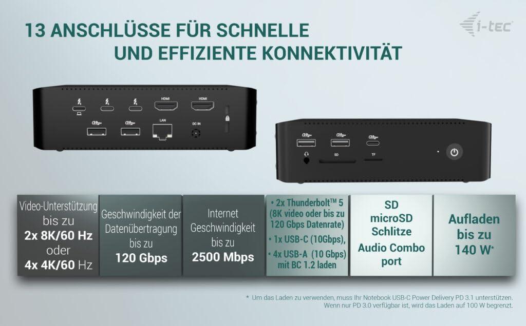 I-TEC Thunderbolt 5 Quattro Display Dock DS 2xTB5 2xHDMI 1x2,5GLAN 1xAudio/Mic 1xUSB-C Gen2 4xUSB-A Gen2 SD+TF Kartenleser PD 140W KL (TB5QUATTRODOCKPD)
