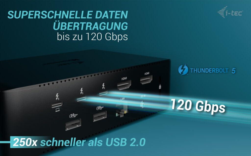 Prestazioni estreme, trasferimento dati ultra veloce e supporto per risoluzioni fino a 8K/60Hz. La docking station i-tec più potente sul mercato! Qualità delle immagini cristallina, Internet ultraveloce e velocità di trasferimento dati fino a 12 GB al secondo grazie all'uscita Thunderbolt 5 integrata. Ovviamente puoi anche collegare cuffie o dispositivi audio e ricaricare il tuo laptop (fino a 140 W**), il tutto tramite un unico cavo (un cavo Thunderbolt 5 da 100 cm è incluso). Il protocollo DP 1.4 integrato consente di collegare questa docking station a un monitor con risoluzione fino a 8K (7680 x 4320) con una frequenza di aggiornamento di 60 Hz, equivalente alla risoluzione di quattro monitor 4K. È la soluzione ideale per grafici, analisti, sviluppatori, editor di video e amanti dei video ad alta risoluzione. La docking station è ora compatibile non solo con le porte Thunderbolt 5/4/3, ma anche con USB4 e USB-C. Si tratta di una soluzione flessibile per le aziende e gli utenti che lavorano con laptop e tablet con porte diverse. Supporta fino a 4 monitor esterni* con risoluzioni fino a 2x 8K/60 o 4x 4K/60 Hz Porte video: 2 x HDMI, 2 x Thunderbolt 5 1x USB-C (10 Gbps) 4x USB-A (10 Gbps) con funzione di ricarica rapida BC 1.2 (7,5 W) porta LAN con velocità fino a a 2,5 Gbit/s (10/100/1000/2500 Mbit/s) Connettore audio/microfono da 3,5 mm 1 slot SD/microSD Ricarica laptop fino a 140 W** Pulsante on/off per docking station * Il numero massimo di monitor collegati dipende dalle prestazioni del computer e del sistema operativo. I laptop Thunderbolt 5 e Windows consentono di collegare fino a quattro monitor (il coperchio del laptop deve essere chiuso). I laptop Apple con macOS supportano al massimo due monitor esterni. ** Se il tuo laptop o tablet supporta il moderno protocollo di ricarica USB-C Power Delivery PD 3.1, la docking station fornisce una potenza di ricarica fino a 140 W (con PD 3.0 la potenza di ricarica è limitata a 100 W).