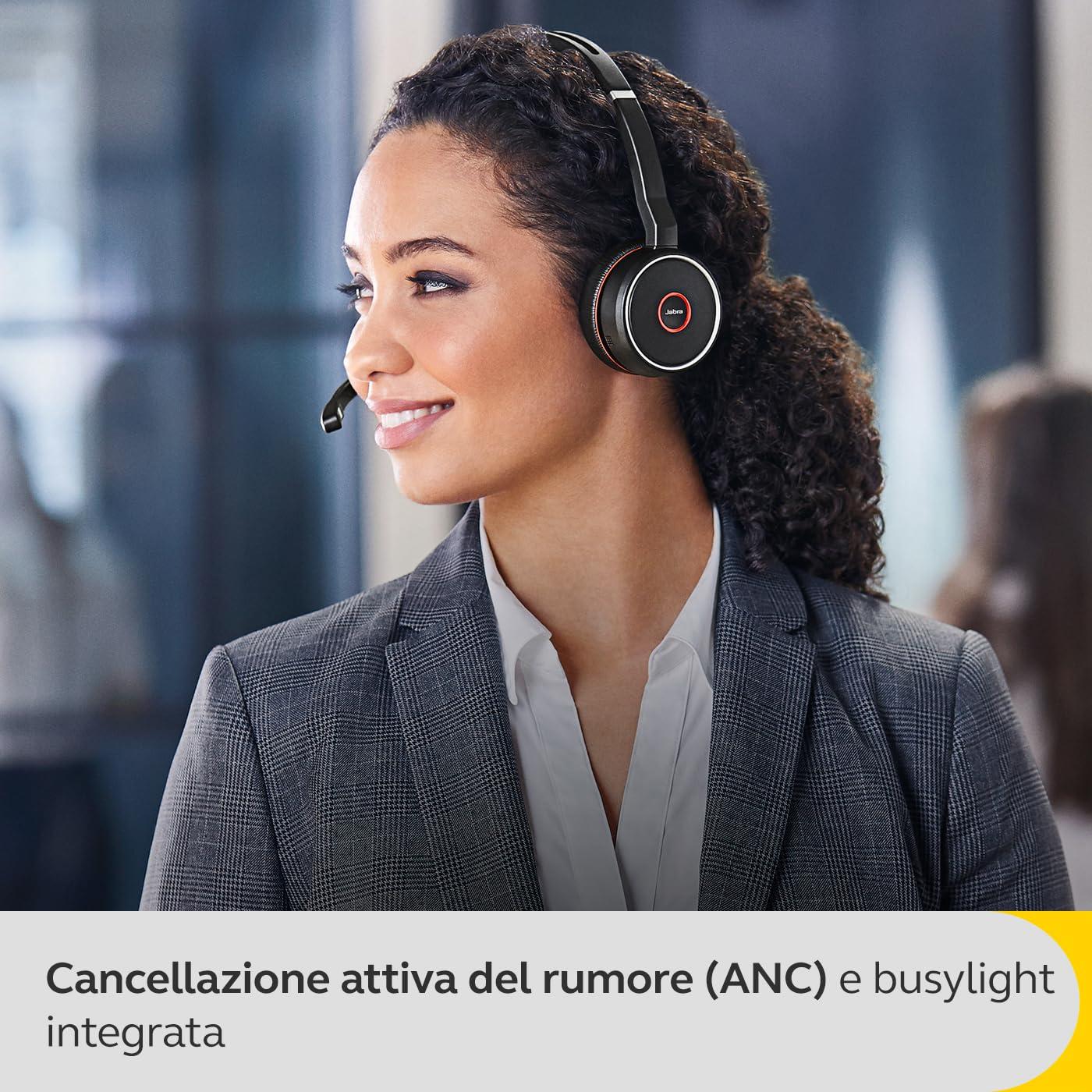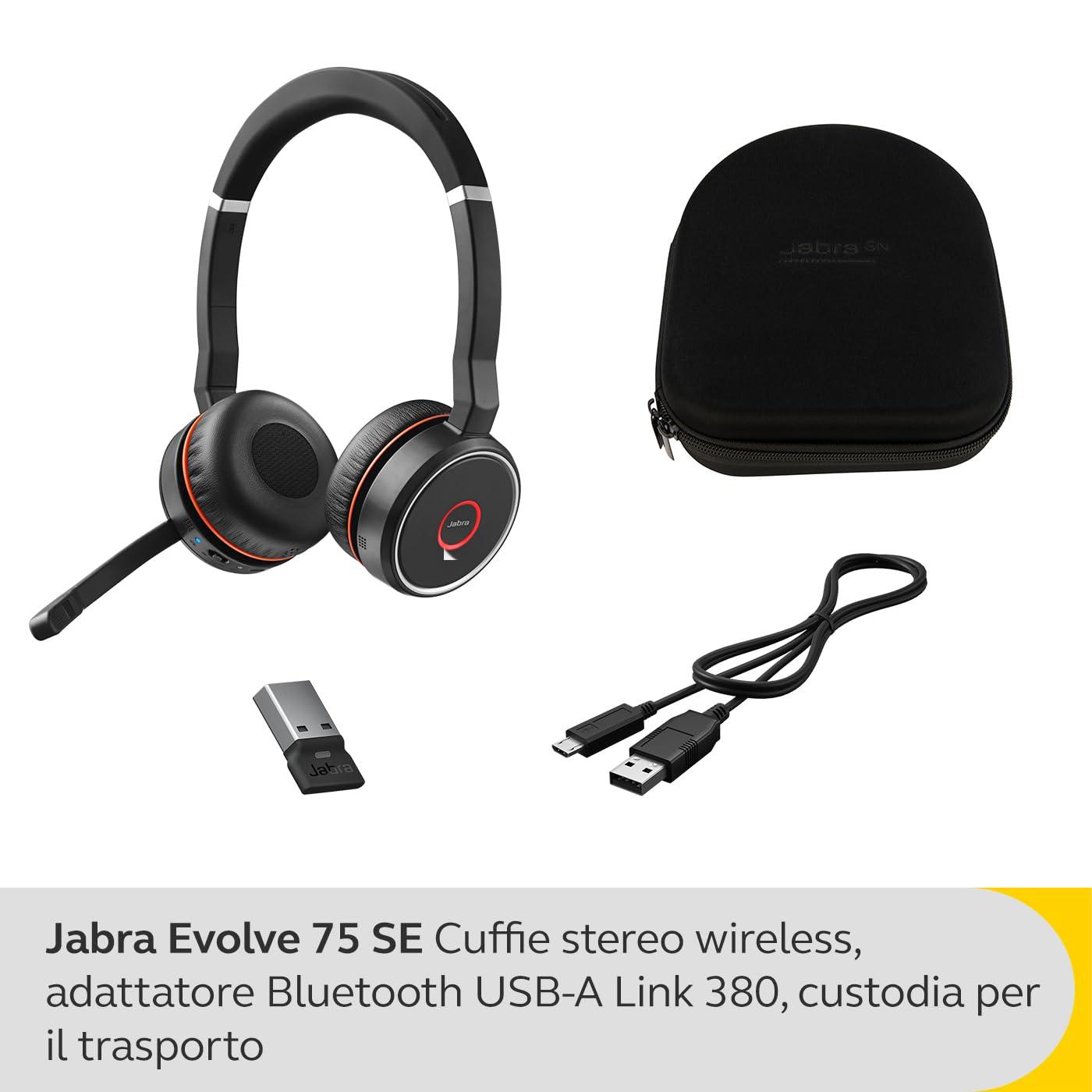 - Nella confezione: Jabra Evolve 75 se cuffie stereo Wireless con adattatore link 380 USB-A, cavo USB di ricarica, custodia da viaggio e opuscolo di sicurezza peso delle cuffie: 177 g colore: Nero