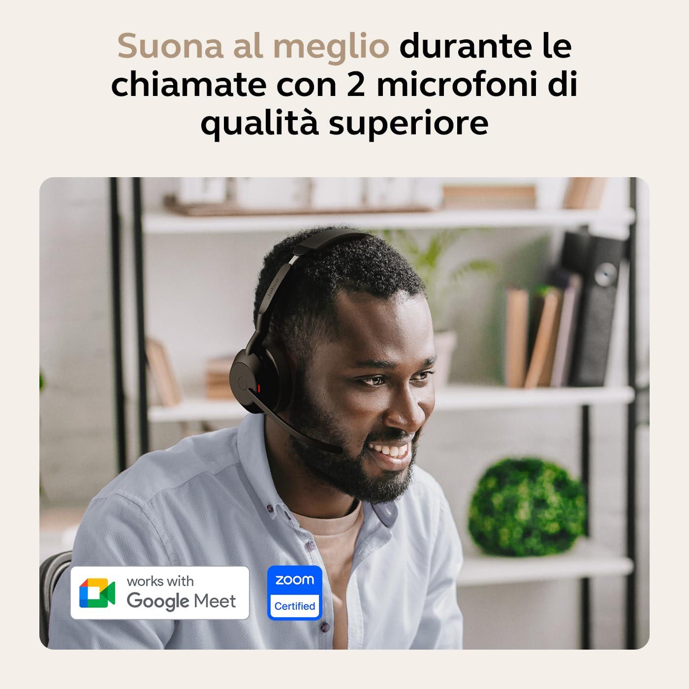 - Collaborazione fluida: le nostre cuffie Evolve2 55 sono pienamente compatibili con le piattaforme di UC come Zoom e Google Meet. L'indicatore di occupato a 360° si accende durante le chiamate