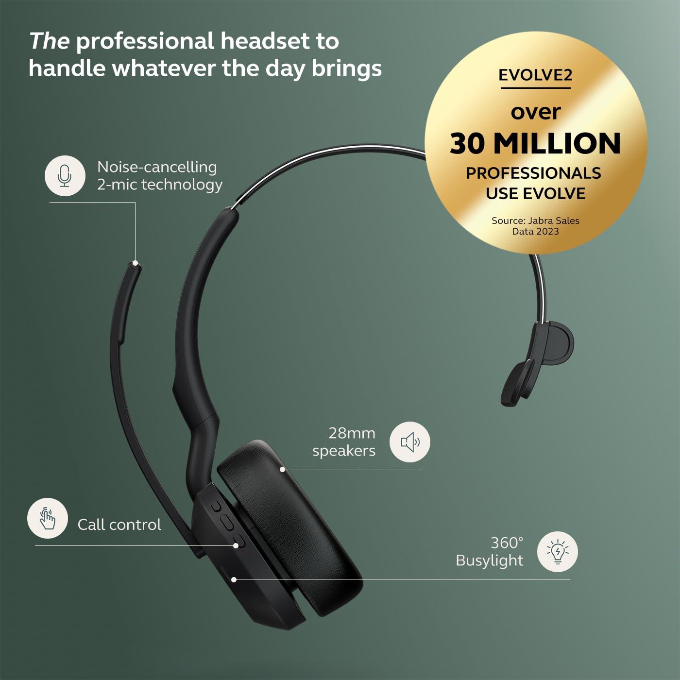 - Nella confezione: 1x Jabra Evolve2 55 Cuffie Wireless Mono Bluetooth con adattatore Bluetooth Link 380 USB-A, cavo USB-A, custodia per il trasporto, peso delle cuffie: 76 g, colore: nero