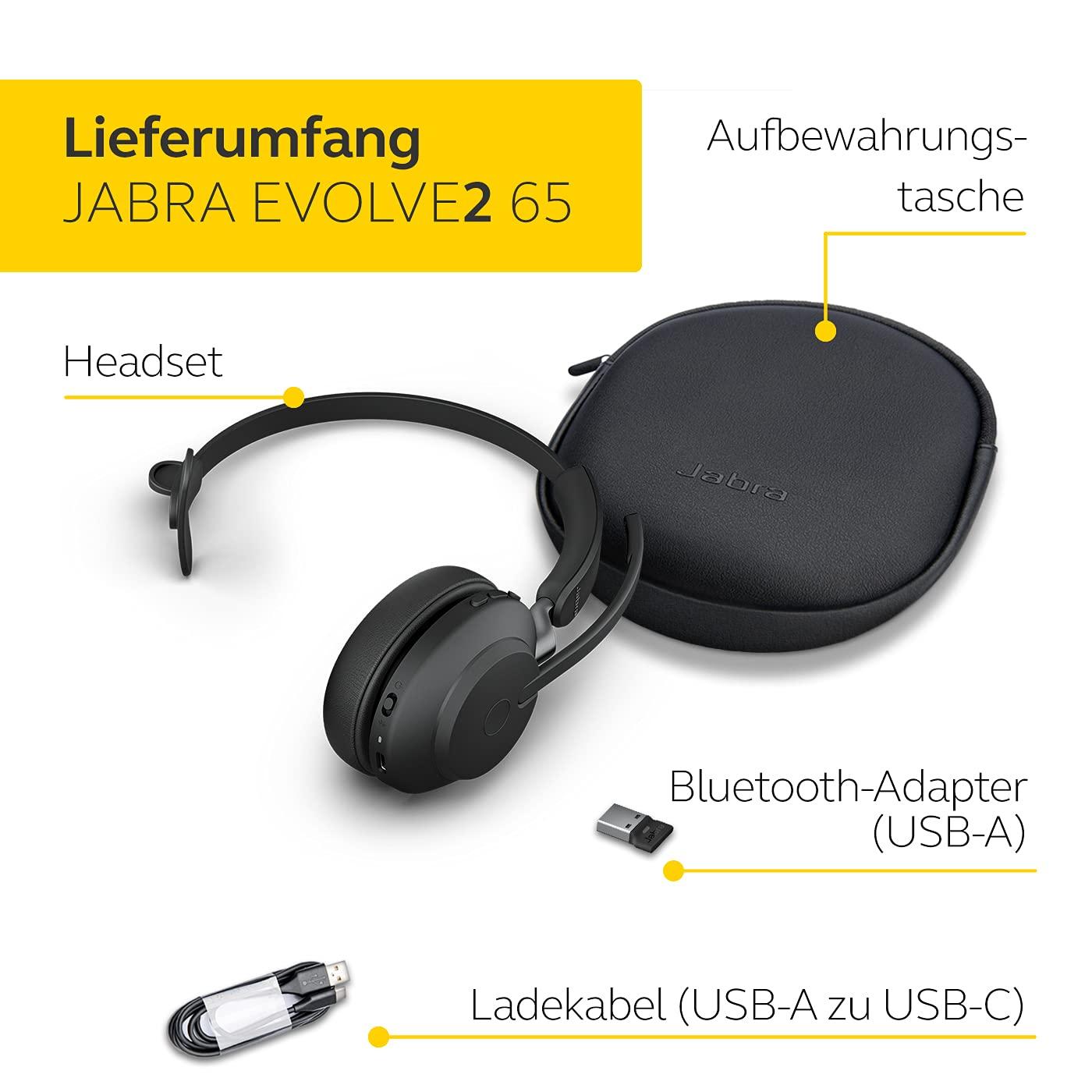 - Consegna: Jabra Evolve2 65 Mono cuffie On-Ear senza fili, adattatore Bluetooth USB-A, cavo USB-C a USB-A da 1.2 m, custodia protettiva, peso cuffie: 99.2 g, dimensioni: 150 x 157 x 60 mm, nero