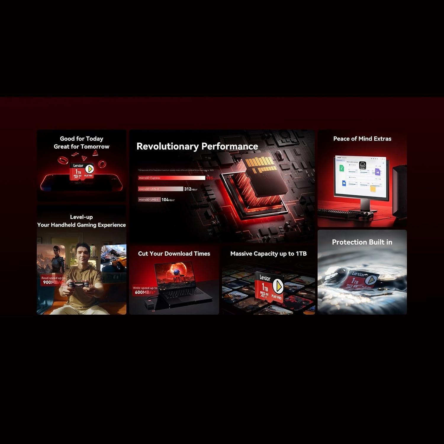LEXAR Carte microSD Express 7.1 PLAY Pro 1 To R900/W600 Boostez votre jeu La carte Lexar PLAY PRO microSDXC Express offre aux joueurs un gain de performance impressionnant avec des vitesses allant jusqu'à 900 Mo/s en lecture et 600 Mo/s en écriture¹, ainsi qu'une capacité allant jusqu'à 1 To pour accueillir de nombreux jeux AAA. Des performances révolutionnaires Grâce à ses technologies de pointe PCIe et NVMe, offrant jusqu'à 900 Mo/s en lecture¹, la carte Lexar PLAY PRO microSDXC Express est 4 fois plus rapide que les cartes microSD UHS-I classiques – ce qui permet un chargement de jeux plus rapide et une expérience fluide, sans latence, sur votre Nintendo Switch 2 et d'autres consoles portables nouvelle génération. Réduisez vos temps de téléchargement Avec ses vitesses d'écriture allant jusqu'à 600 Mo/s¹ lorsqu'elle est utilisée avec le lecteur Lexar microSD Express, vous pourrez télécharger un jeu AAA en moins de temps qu'il ne faut pour commander une pizza ! Capacité massive jusqu'à 1 To Certains de vos jeux préférés occupent sûrement beaucoup d'espace. Avec jusqu'à 1 To de stockage, gérer votre bibliothèque devient plus simple : vous pouvez stocker de nombreux jeux sur une seule carte. Parfaite aujourd'hui, idéale pour demain La carte Lexar PLAY PRO microSDXC Express est rétrocompatible avec les appareils UHS-I et UHS-II (à vitesse UHS-I) : vous pouvez donc l'utiliser avec vos consoles portables actuelles – et elle est parfaite pour la Nintendo Switch 2. Protection