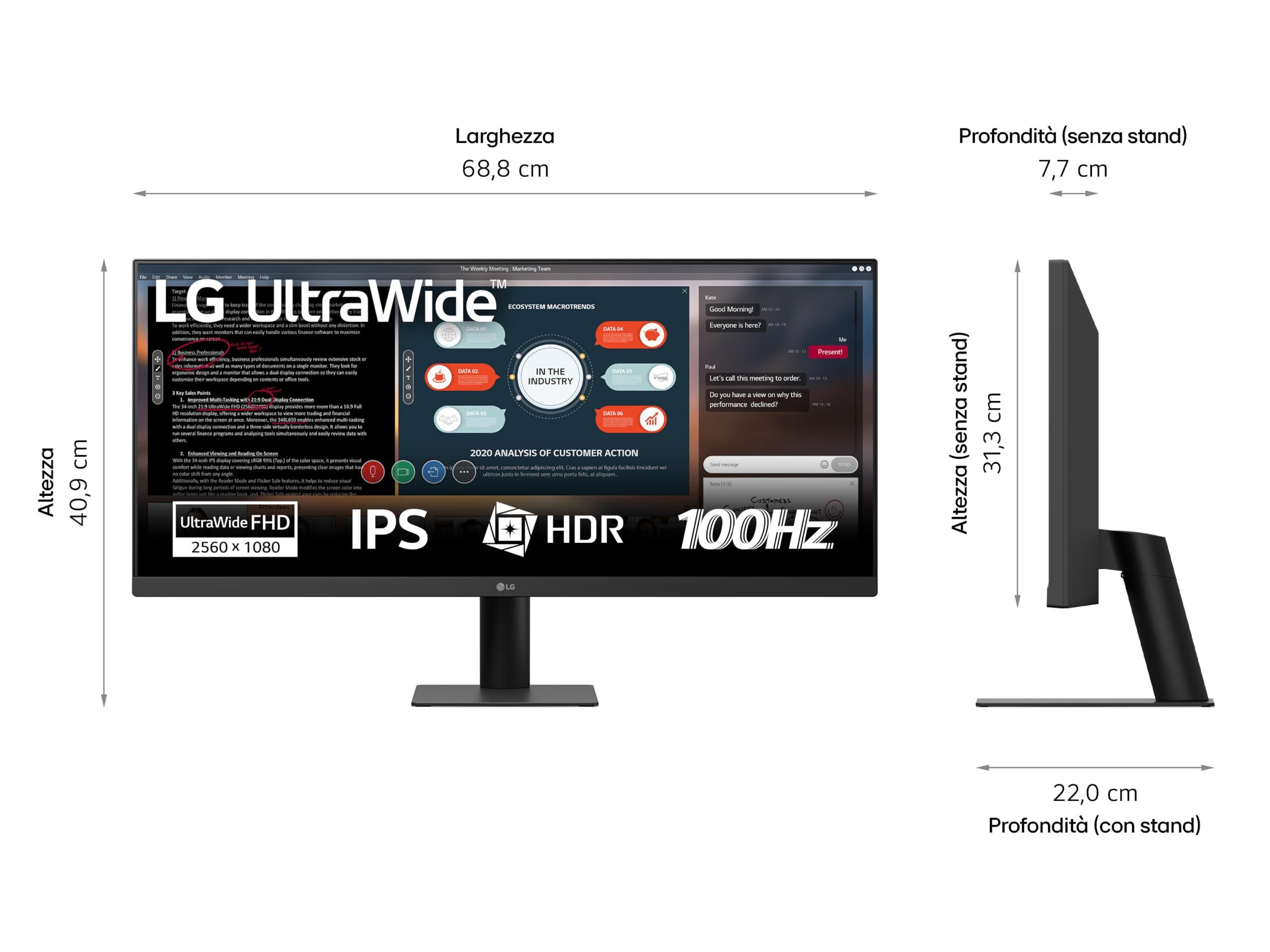 LG 29U511A Monitor UltraWide 21:9 29" IPS, WFHD (2560x1080), HDR10, 100Hz, sRGB 99%, HDMI, DisplayPort, Uscita Cuffie, Schermo Antiriflesso, Reader Mode, Flicker Safe, Nero