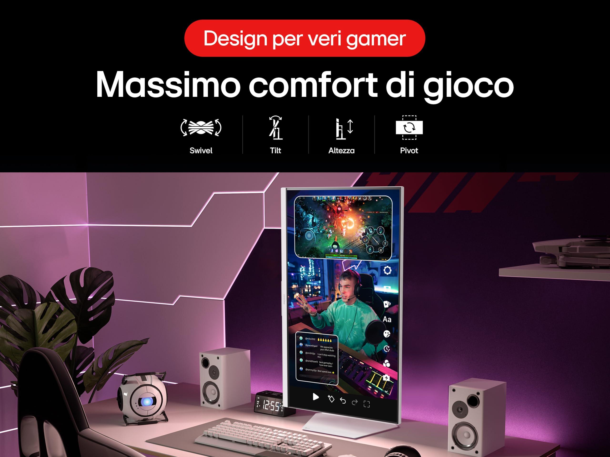 - DESIGN DA GAMER: esalta la tua esperienza di gioco con un design accattivante senza cornici su tre lati e con illuminazione ambientale. La base regolabile in altezza, inclinazione, swivel e pivot ti aiuta a giocare nella posizione più confortevole.