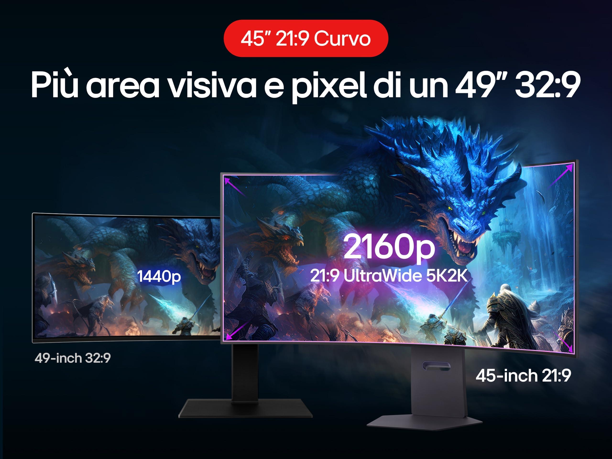 - MONITOR 45" OLED: i pixel autoilluminanti assicurano contrasto infinito e nero ottimo, per immagini prive di aloni e dai colori brillanti e luminosi