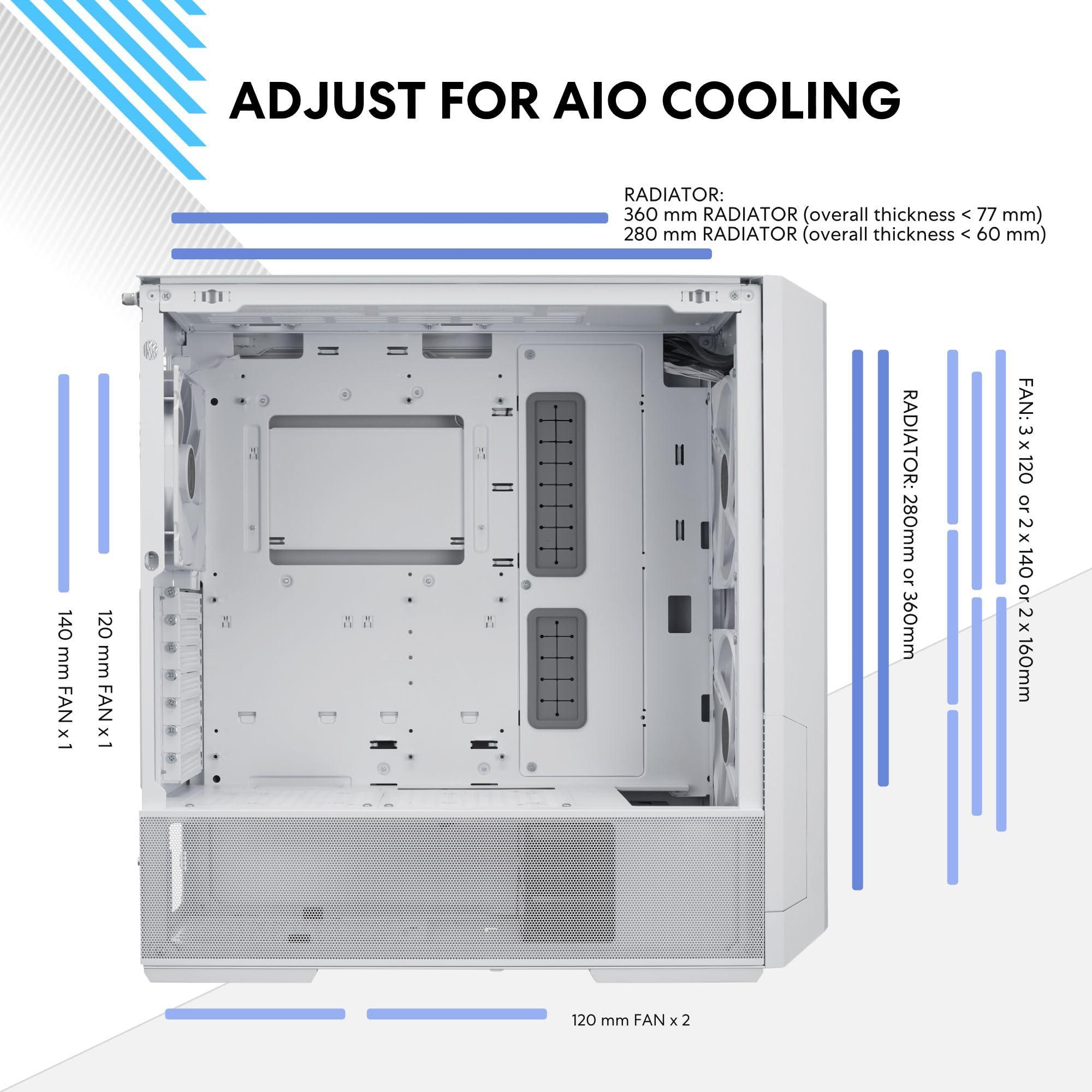 - Dotato di 2 ventole PWM frontali da 160 (ARGB o non RGB) e 1 ventola PWM posteriore da 140 mm; supporta radiatori a 360 gradi nella parte alta, anteriore e un max di 10 ventole; include una staffa posteriore per ventola PCIe; I/O anteriore che può essere riposizionato verso il basso; soluzione completa per la gestione dei cavi