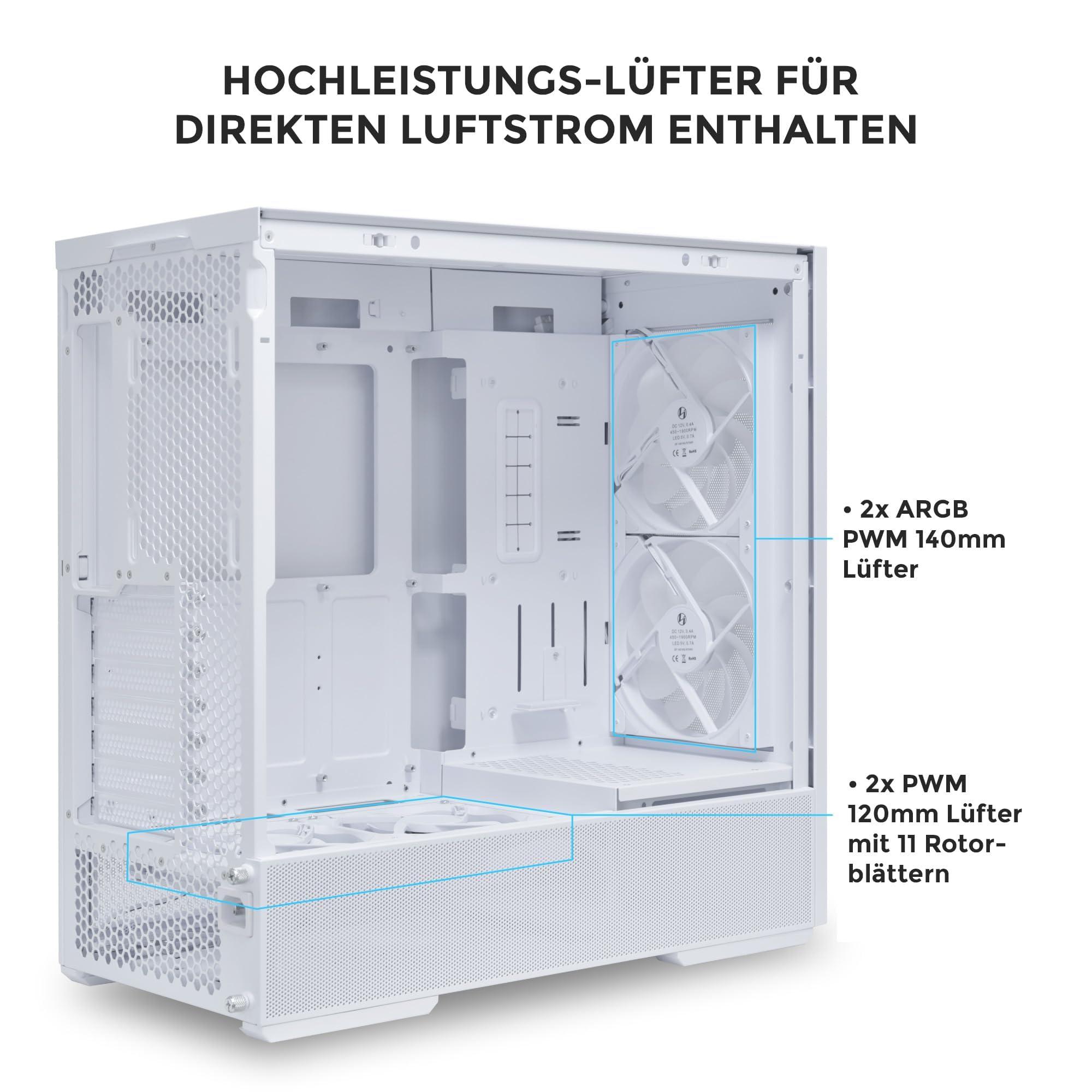 - Eccellente flusso d'aria: due ventole ARGB e due ventole aggiuntive sono preinstallate e garantiscono una circolazione dell'aria ottimale e un rumore di funzionamento silenzioso in questa scatola PC ATX con quattro ventole.