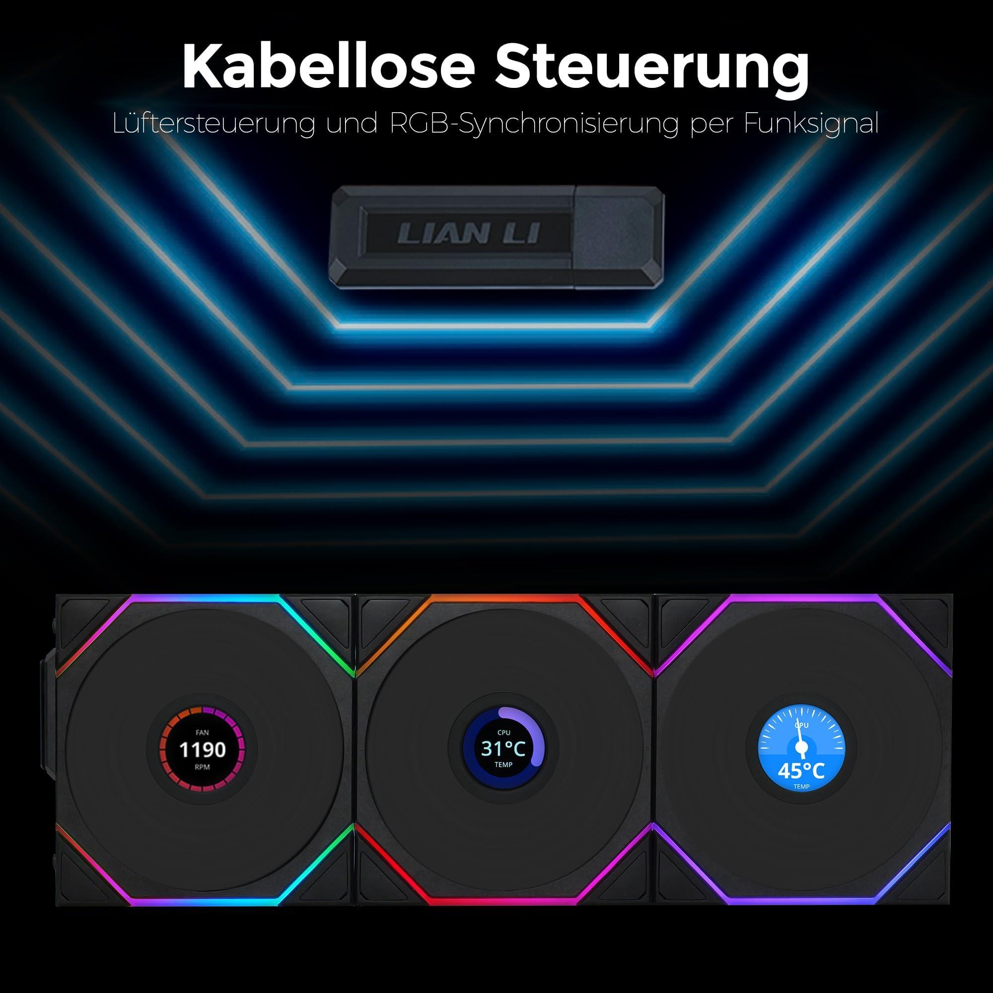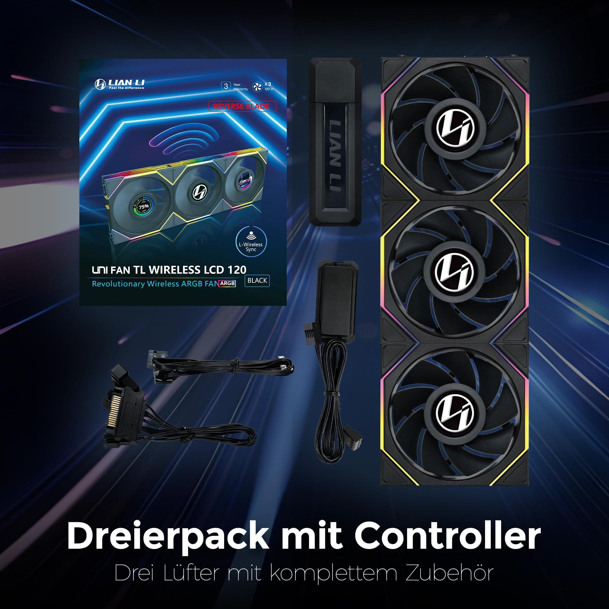 Lian Li UNI FAN TL Wireless LCD Lüfter, ARGB, PWM, 3er-Pack inkl. Controller - Reverse Blade, 120mm, schwarz