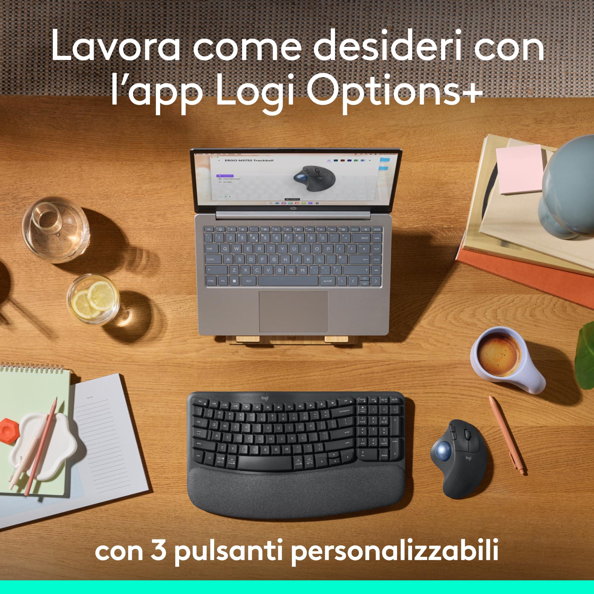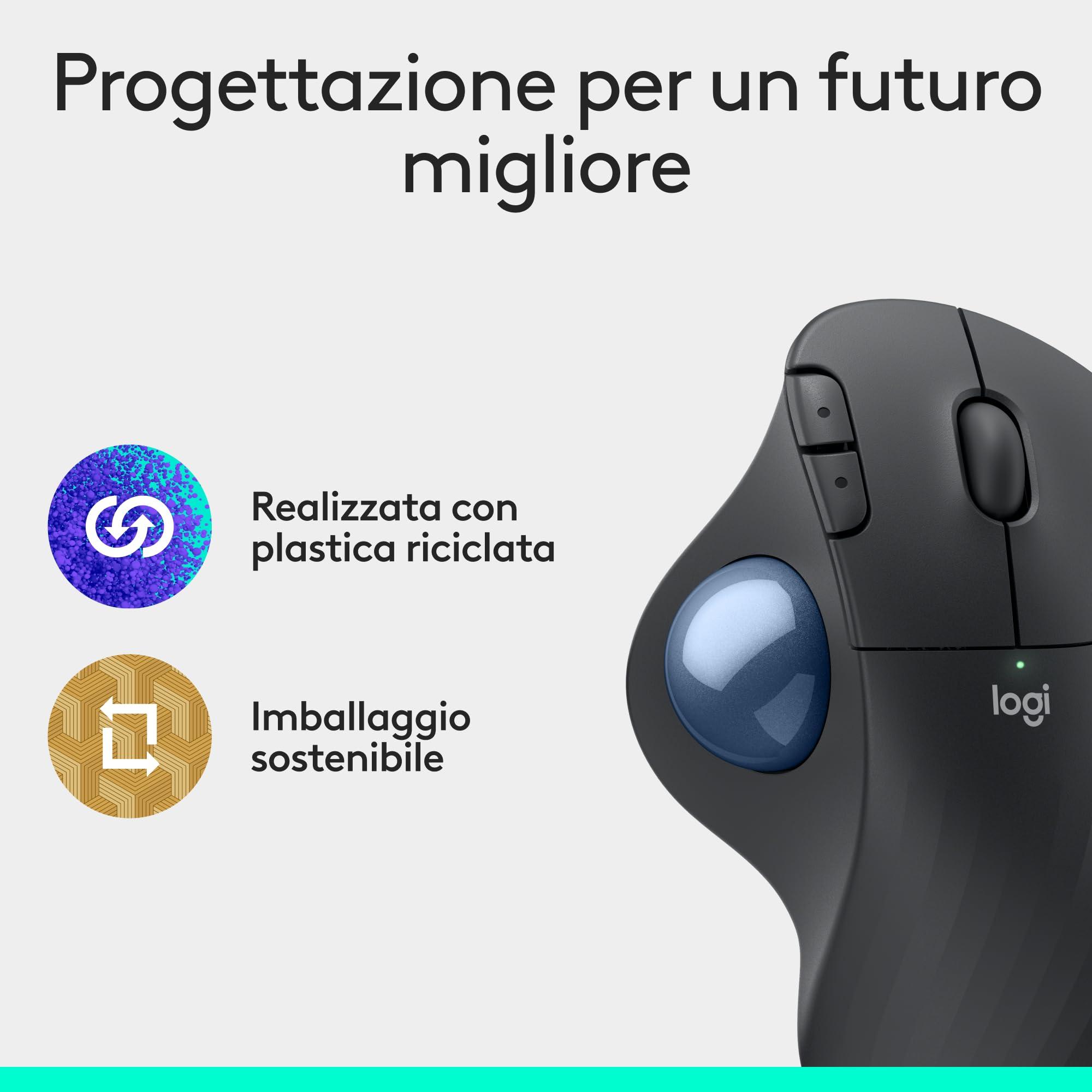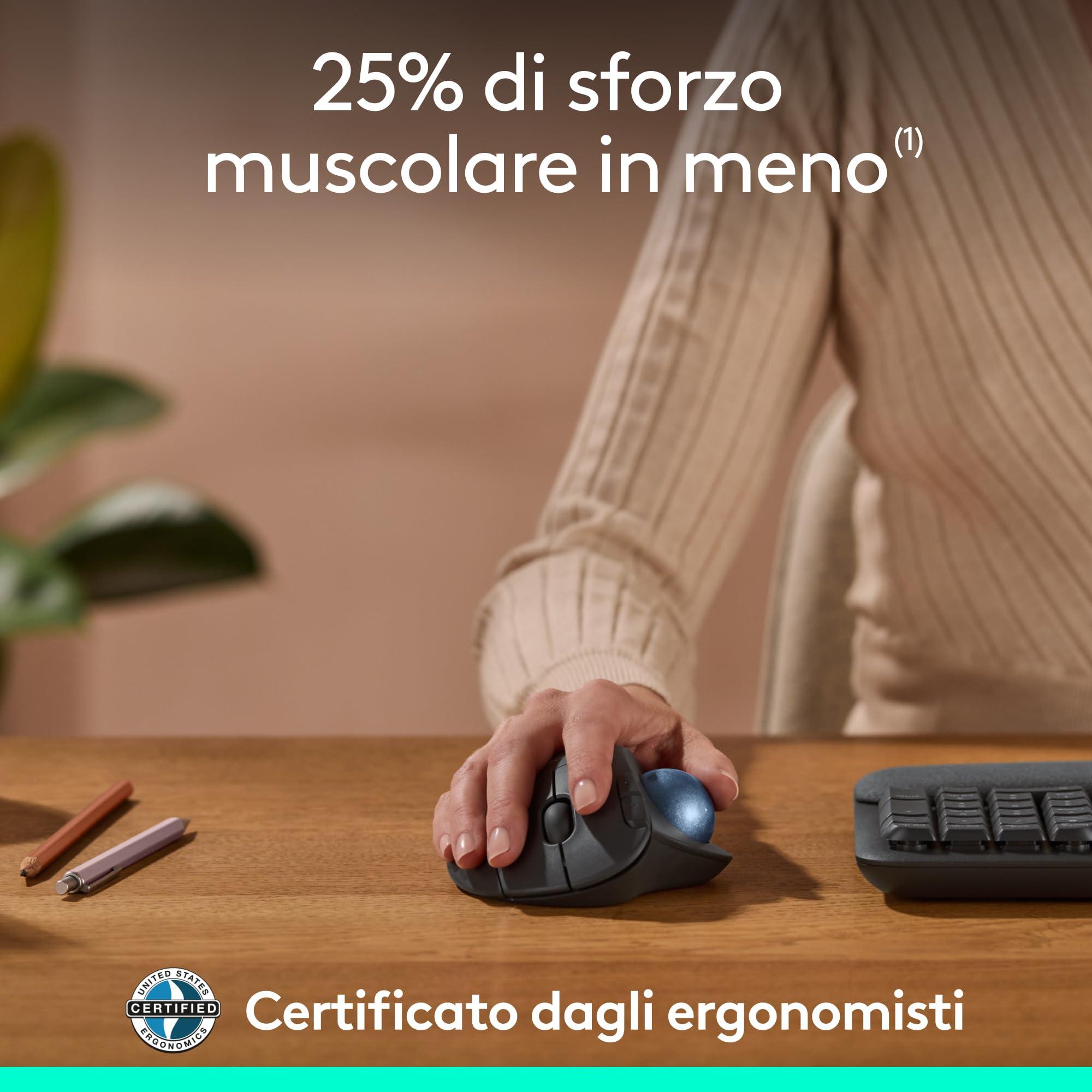 - Meno movimenti, più comfort: la forma sagomata del mouse trackball wireless ERGO M575S mantiene la tua mano rilassata per ore di tracciamento fluido e preciso con il controllo tramite pollice, ora con clic discreti