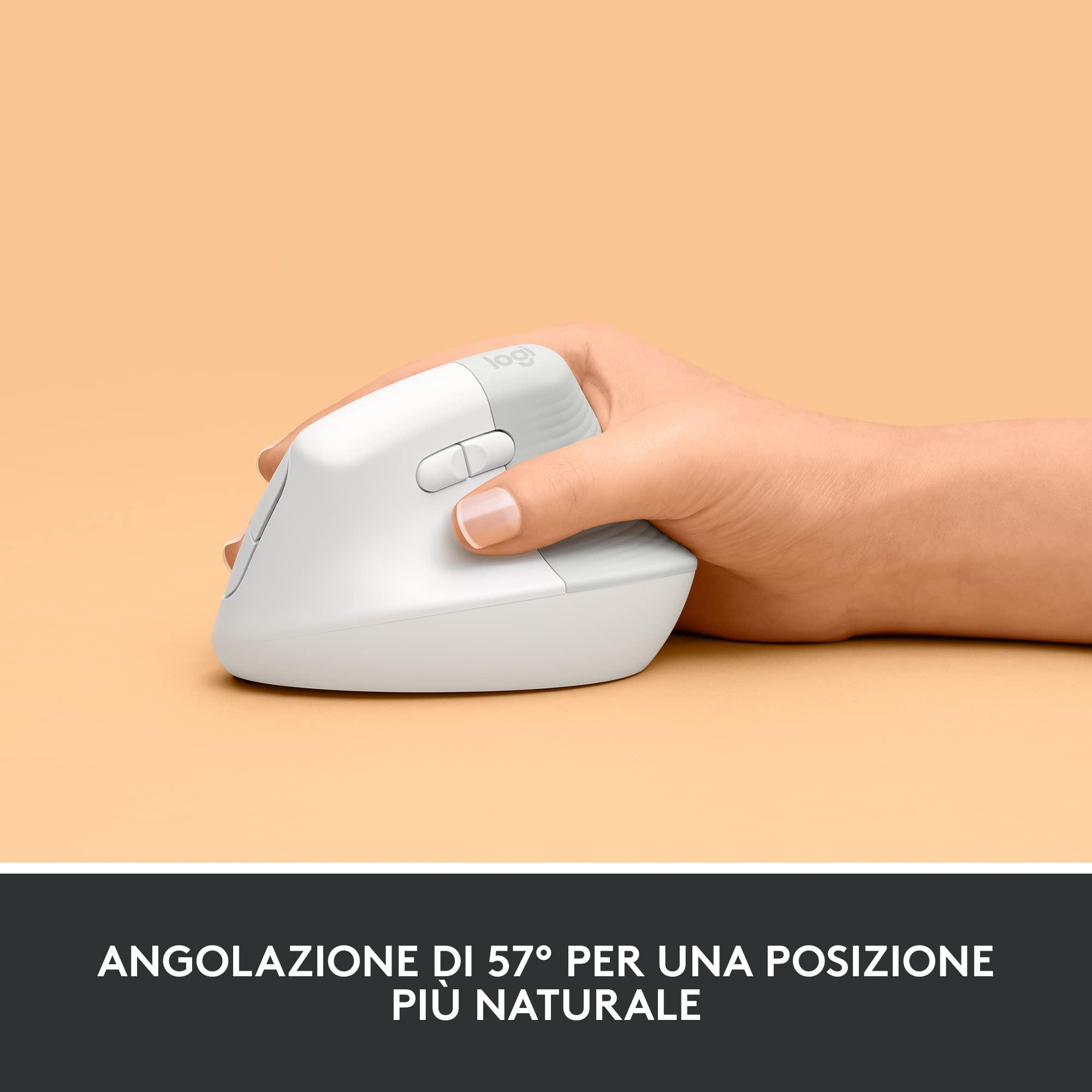 Logitech Lift Mouse Ergonomico Verticale, Senza Fili, Ricevitore Bluetooth o Logi Bolt USB, Clic Silenziosi, 4 Tasti, Compatibile con Windows, macOS, iPadOS, Laptop, PC - Bianco