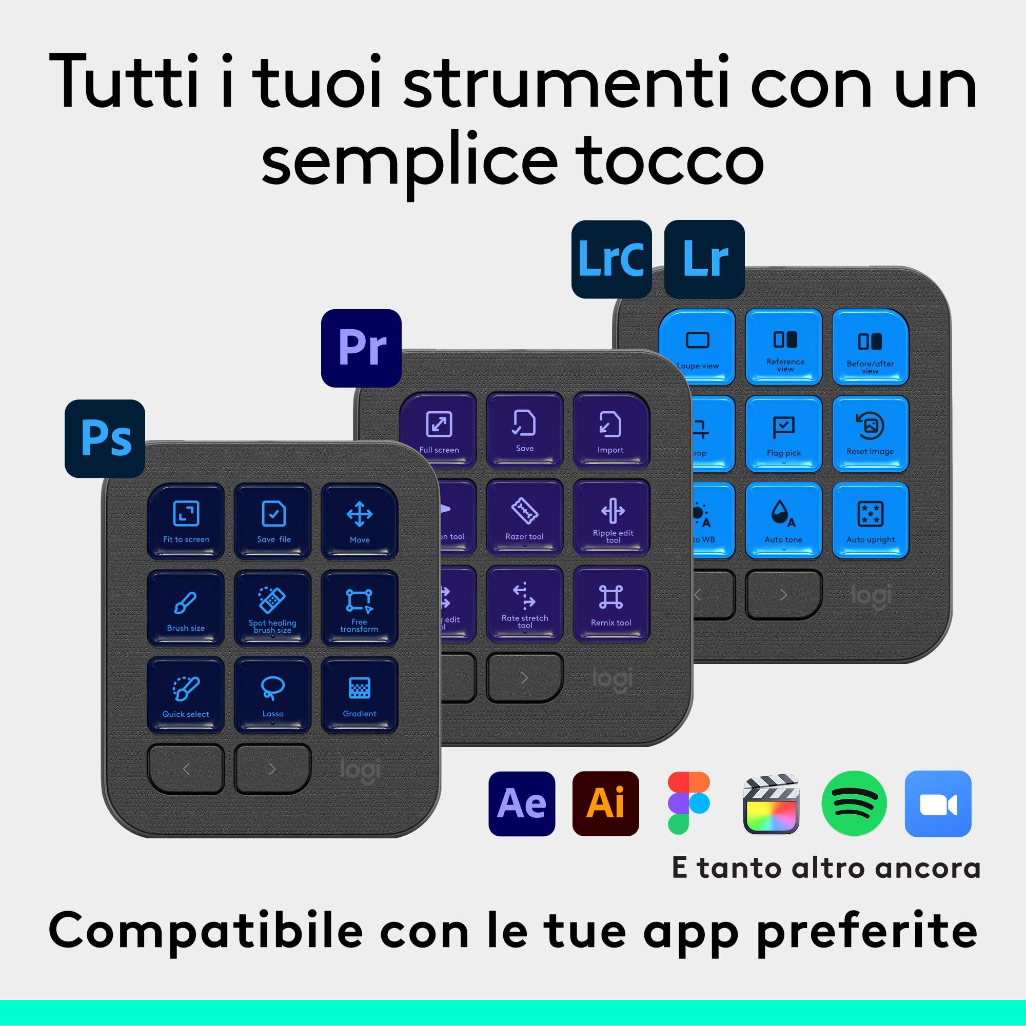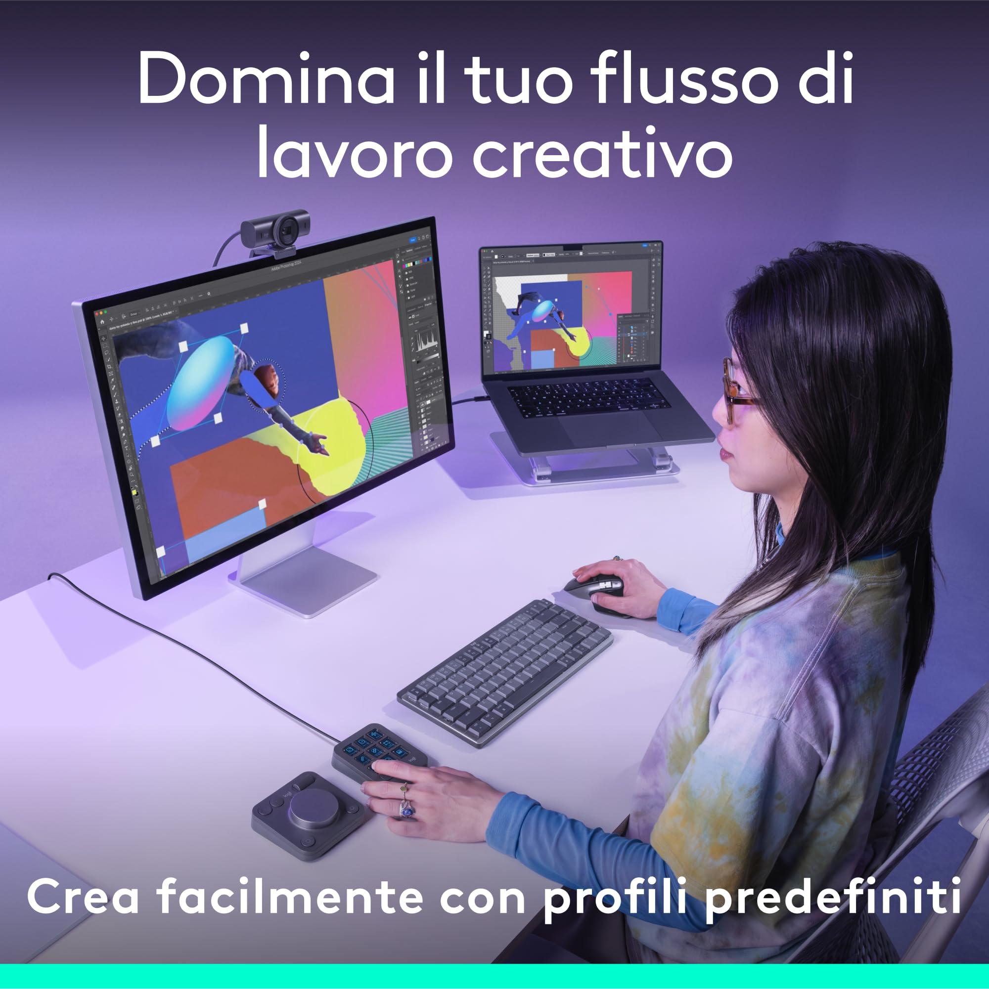 - Accelera il tuo flusso di lavoro creativo: Logitech MX Creative Console ti consente di accedere rapidamente a strumenti e azioni sulle tue app preferite, per concentrarti interamente sul tuo lavoro