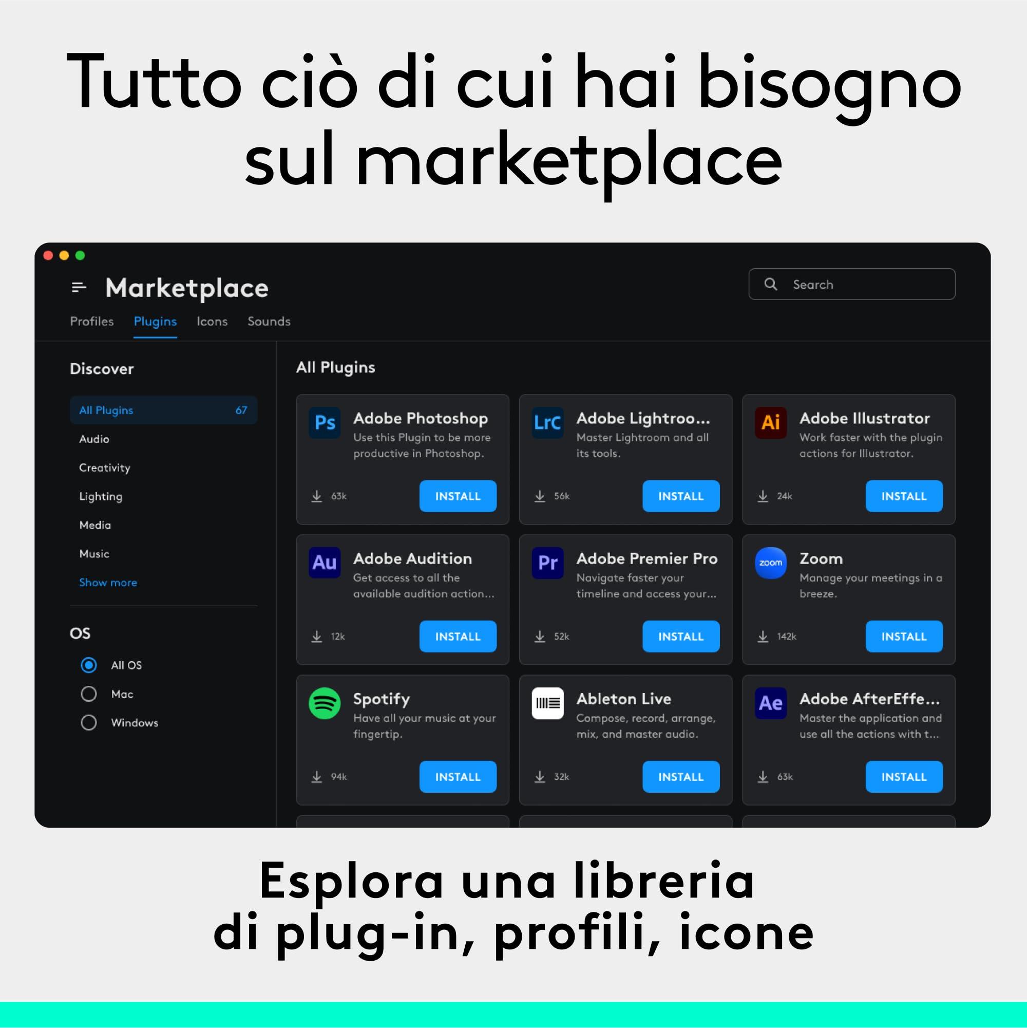 - Scopri di più sul marketplace: trova una libreria in crescita di azioni e plugin, profili consigliati, pacchetti di icone e altro ancora sul marketplace nell’app Logi Options+(2)