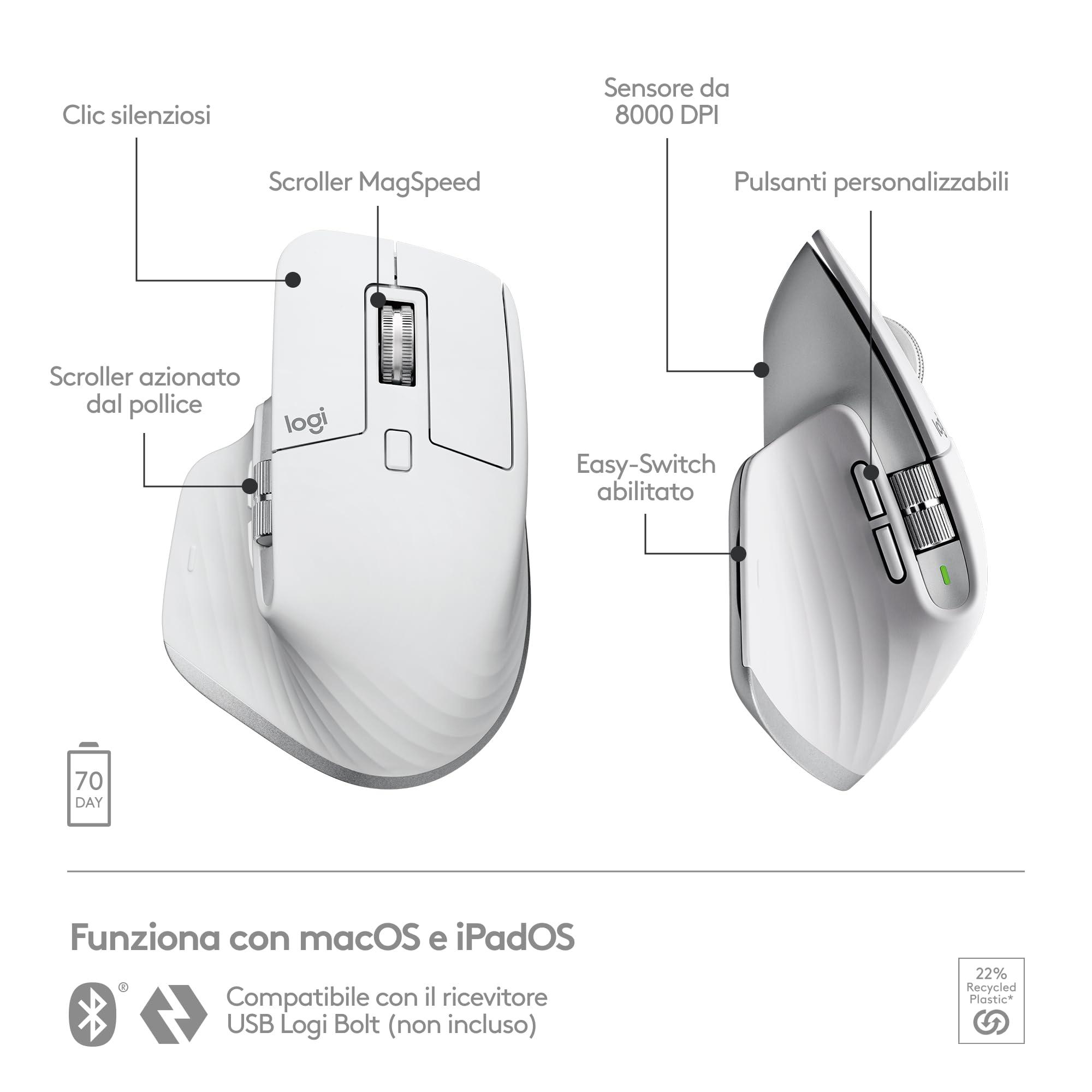 - Alte prestazioni: il mouse Bluetooth MX Master 3S per Mac è dotato di un sensore 8K DPI che traccia su vetro (2) e click silenziosi, con il 90% di rumore in meno (3)