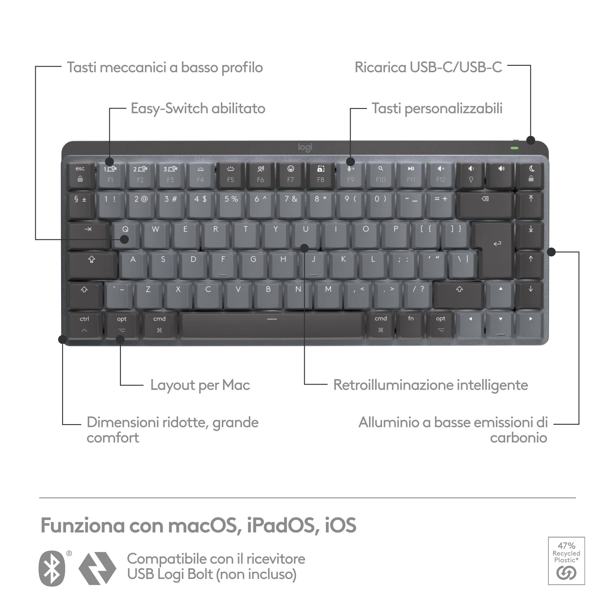 - Ideale per Mac: la tastiera Bluetooth MX Mechanical Mini per Mac presenta un layout di tasti per Mac progettati per tatto e produttività, ottimizzata per macOS e compatibile con iPadOS e iOS(1)