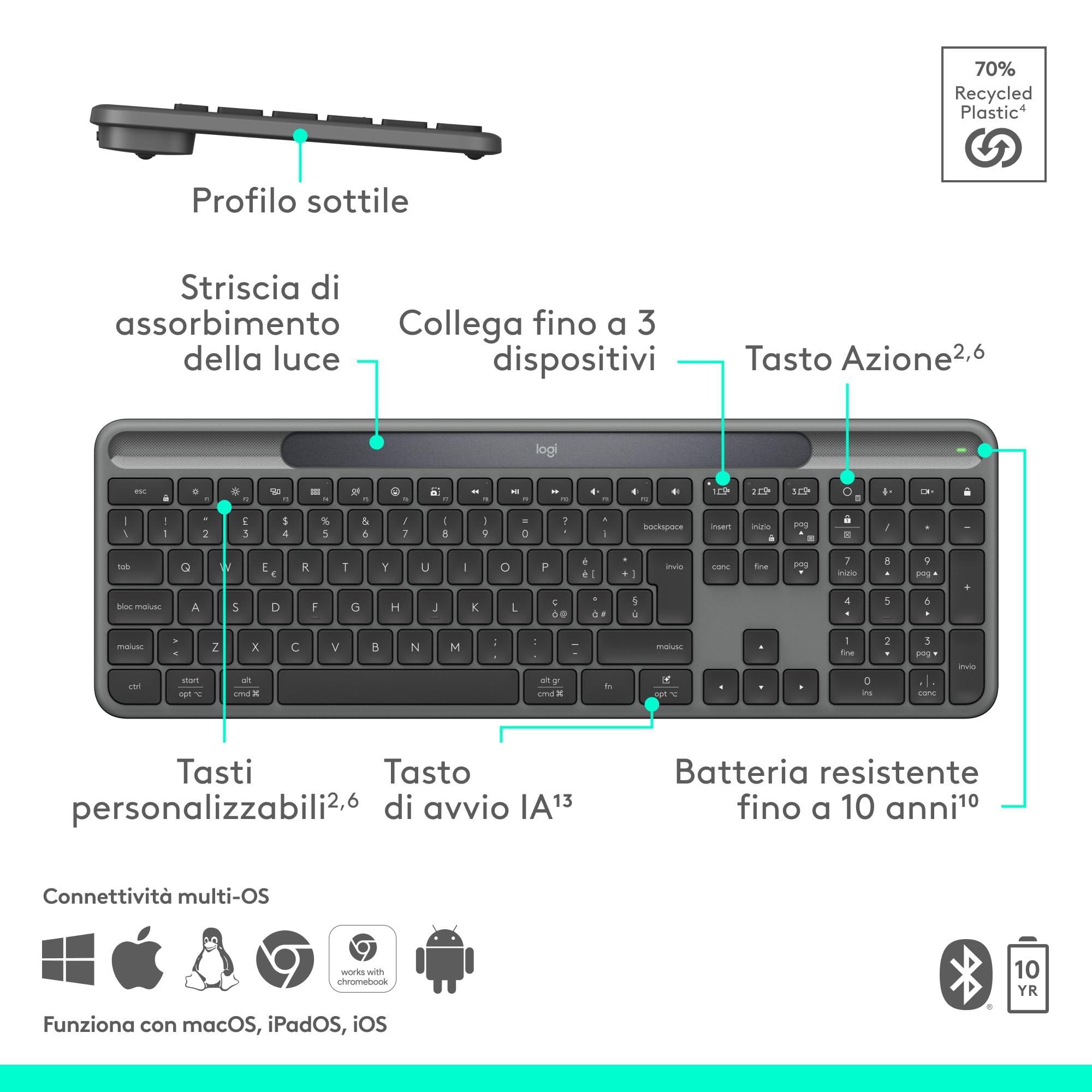 Logitech Signature Slim Solar+, tastiera wireless alimentazione a luce solare e artificiale, batteria resistente che dura fino a 10 anni, tasti personalizzabili, Bluetooth, Italiano QWERTY - Grafite