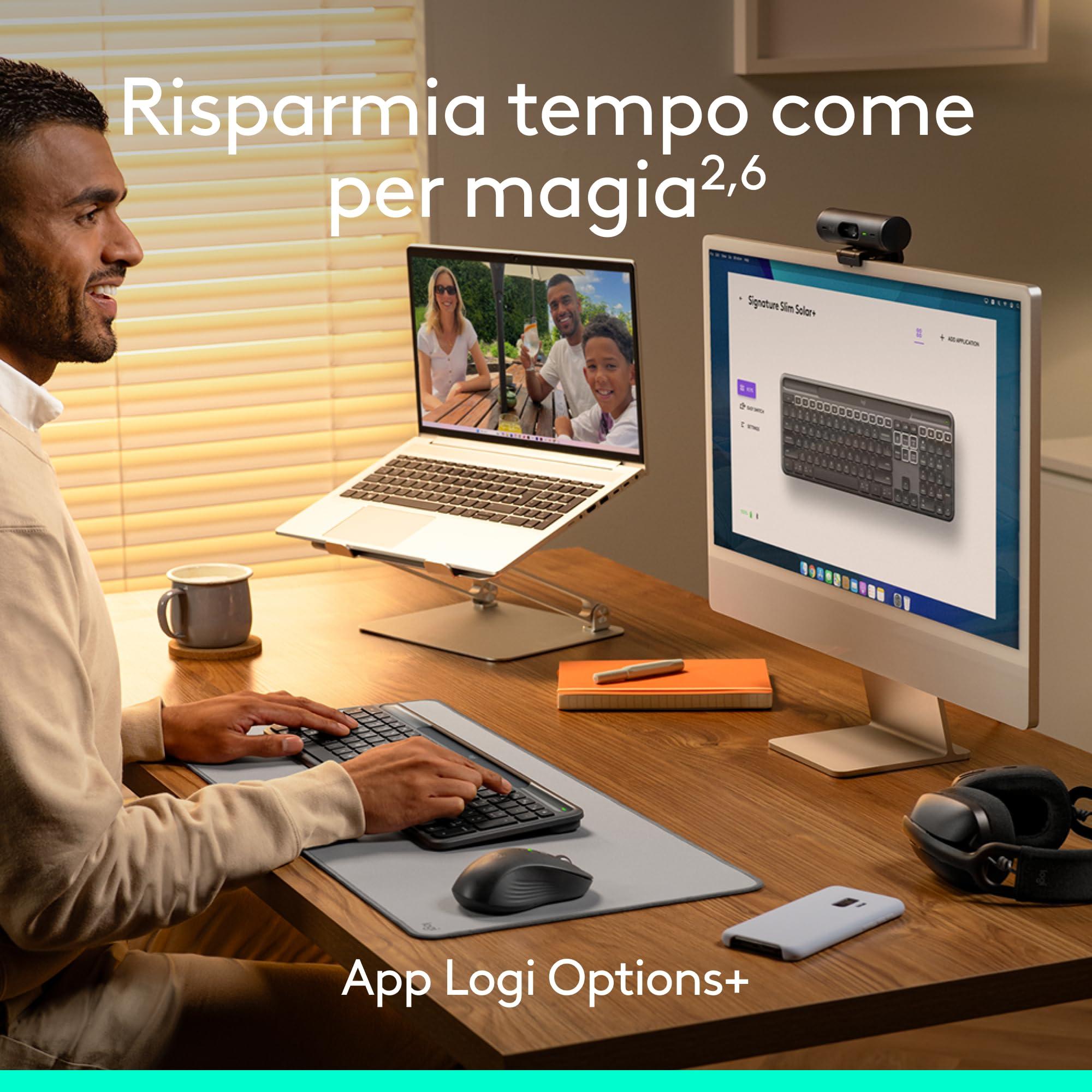 - Con tecnologia Logi LightCharge: una ricarica innovativa che combina una striscia di assorbimento della luce e una batteria resistente a basso consumo energetico integrata nella tastiera Signature Slim Solar+