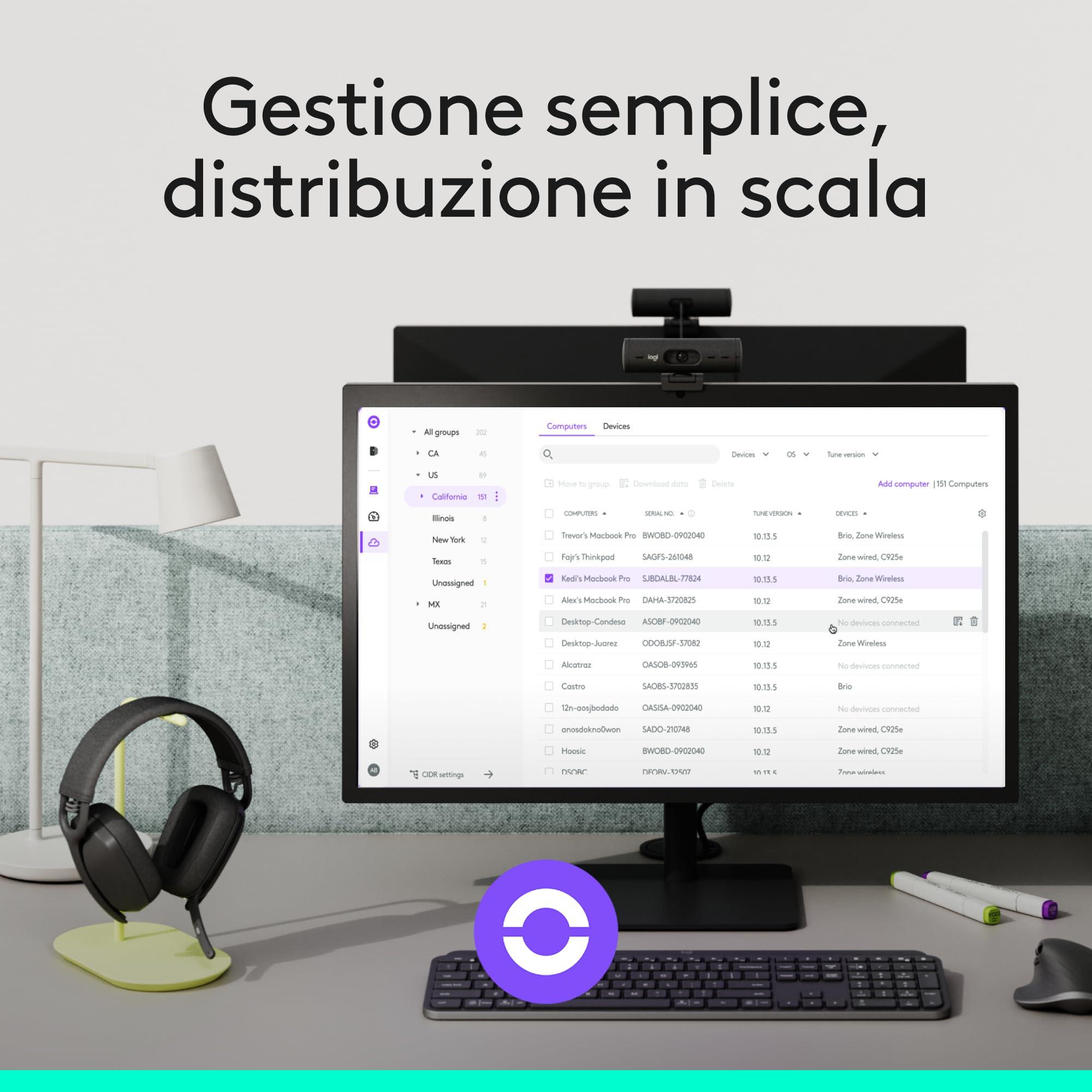 - Semplicità di gestione dei dispositivi: Logitech Sync garantisce che i dispositivi di collaborazione video Logitech dei dipendenti siano integri e aggiornati.