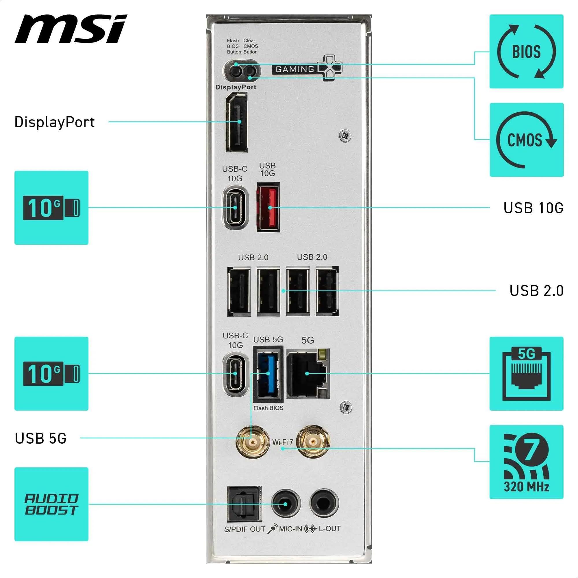 - CONNETTIVITÀ - L'hardware di rete include un modulo Wi-Fi 7 a piena velocità con Bluetooth 5.4 e LAN 5Gbps; le porte posteriori includono USB 10Gbps Type-C e audio HD 7.1 con Audio Boost