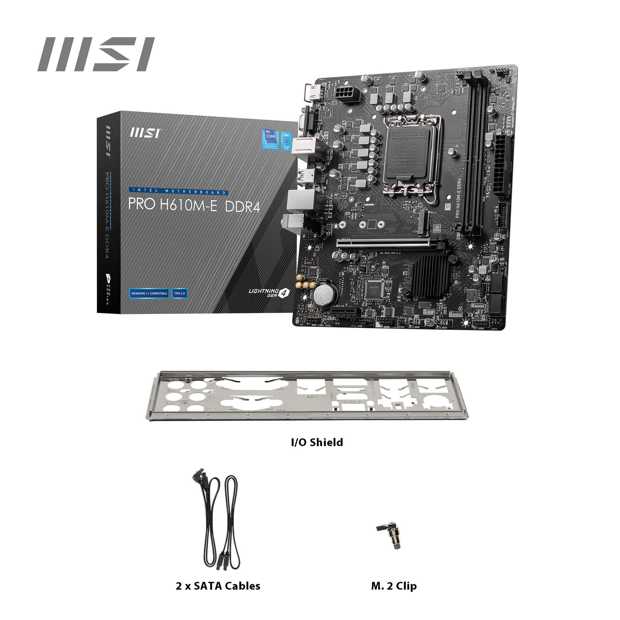 - Mainboard|MSI|Intel H610|LGA1700|MicroATX|Memory DDR4|Memory slots 2|1xPCI-Express 1x|1xPCI-Express 16x|1xM.2|1x15pin D-sub|1xHDMI|4xUSB 2.0|2xUSB 3.2|1xPS/2|1xRJ45|3xAudio port|PROH610M-EDDR4