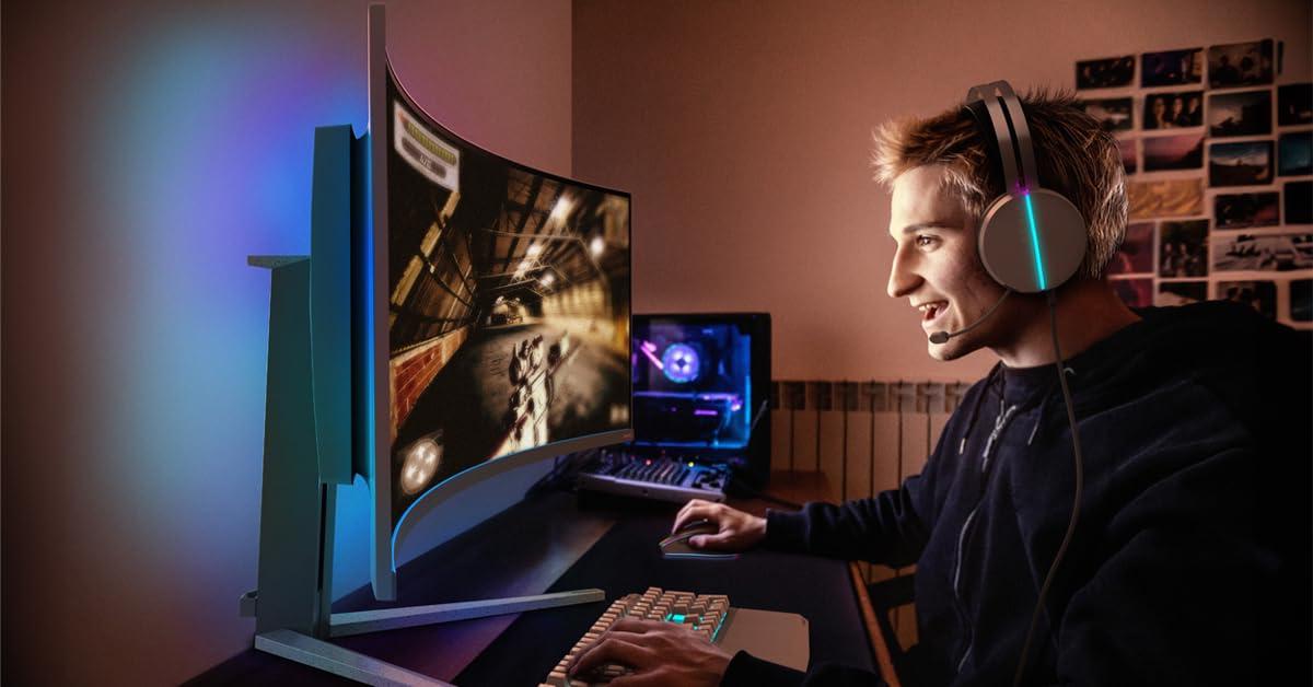- Pannello QD-OLED 32:9 ad alto contrasto con raggio 1800R, uscita cuffie, cornice sottile, compatibile con montaggio VESA 100x100, supporto rimovibile, altezza regolabile 150 mm