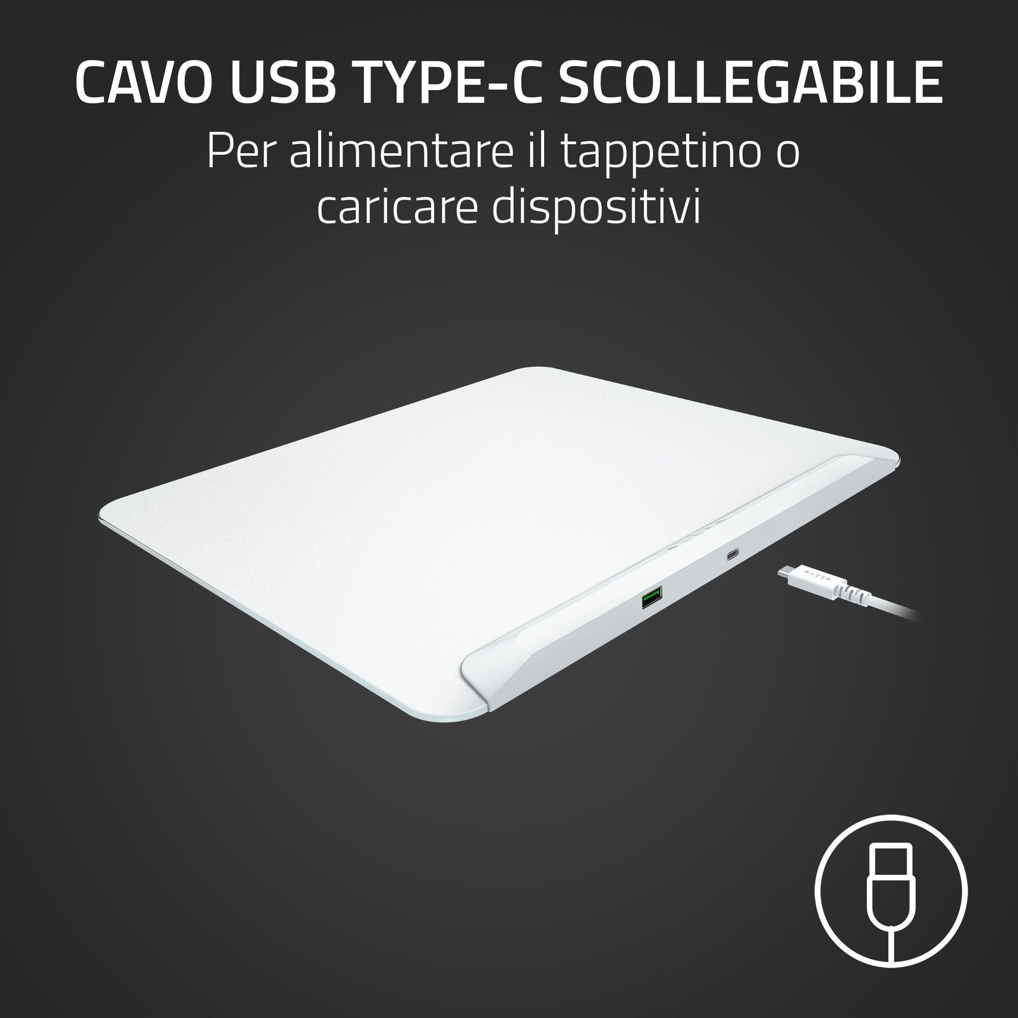 - Cavo USB di tipo C staccabile: per alimentare il tappetino o ricaricare i dispositivi: Al termine di una lunga sessione di gioco, è possibile passare rapidamente dall'alimentazione del tappetino per mouse alla ricarica del mouse wireless o di qualsiasi altro dispositivo USB Type C.