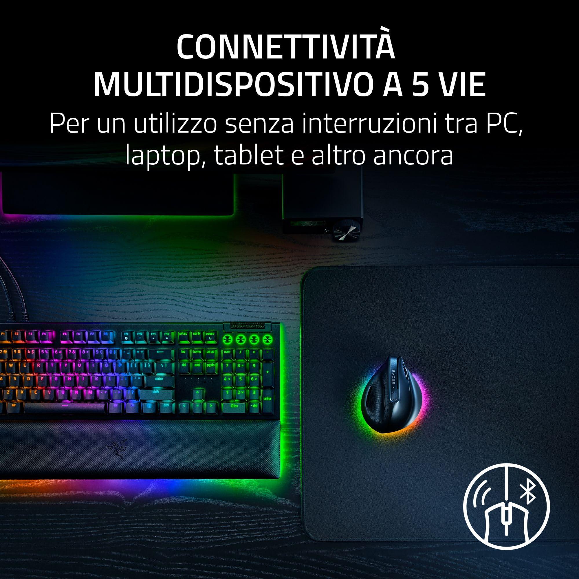 - Connettività multidispositivo a 5 vie - per un utilizzo senza interruzioni tra PC, laptop, tablet e altro ancora: Massimizza l'efficienza e controlla il tuo intero setup con un solo mouse: collega fino a 5 dispositivi in modalità HyperSpeed Wireless, Bluetooth (3 host) o via cavo.