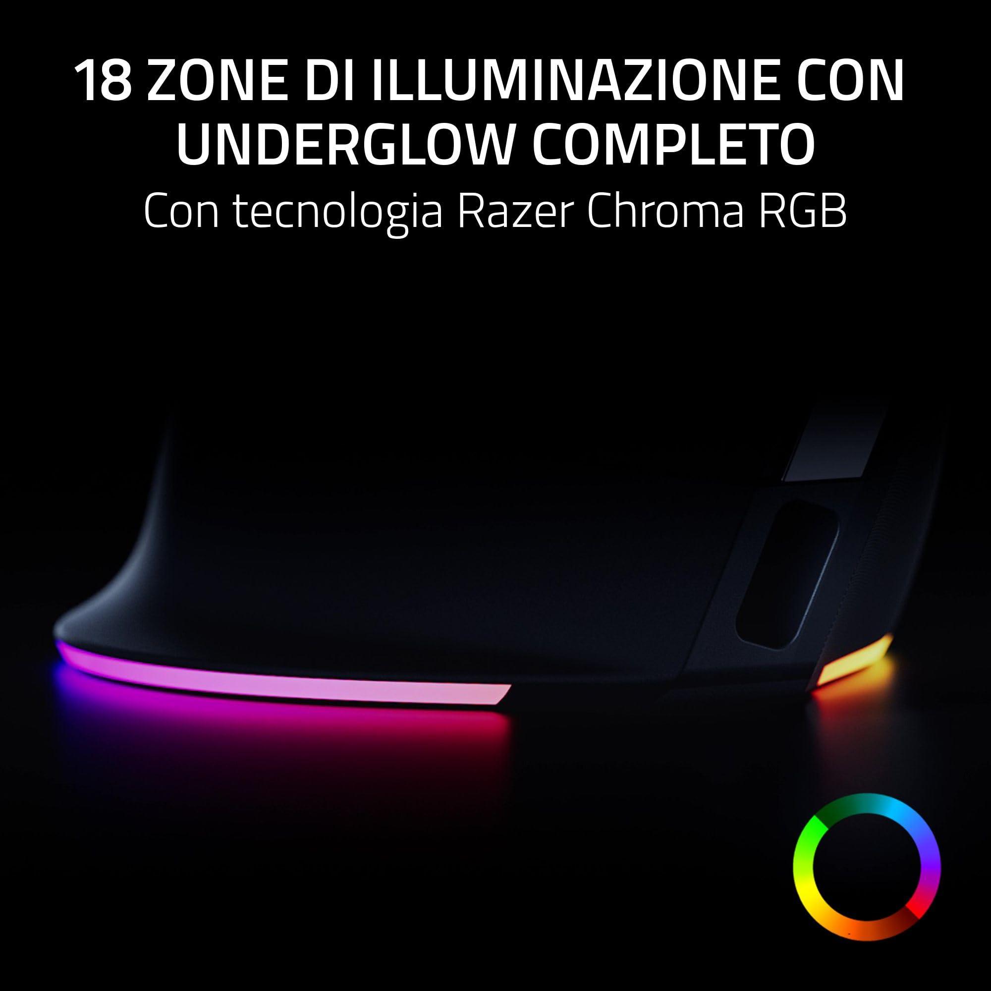 - 18 zone di illuminazione - con underglow completo con tecnologia Razer Chroma RGB: Attiva l'RGB reattivo per le tue notifiche con i plugin disponibili su Chroma Workshop - Personalizza ogni zona con 16,8 milioni di colori e sperimenta una maggiore immersione con oltre 300 giochi integrati.