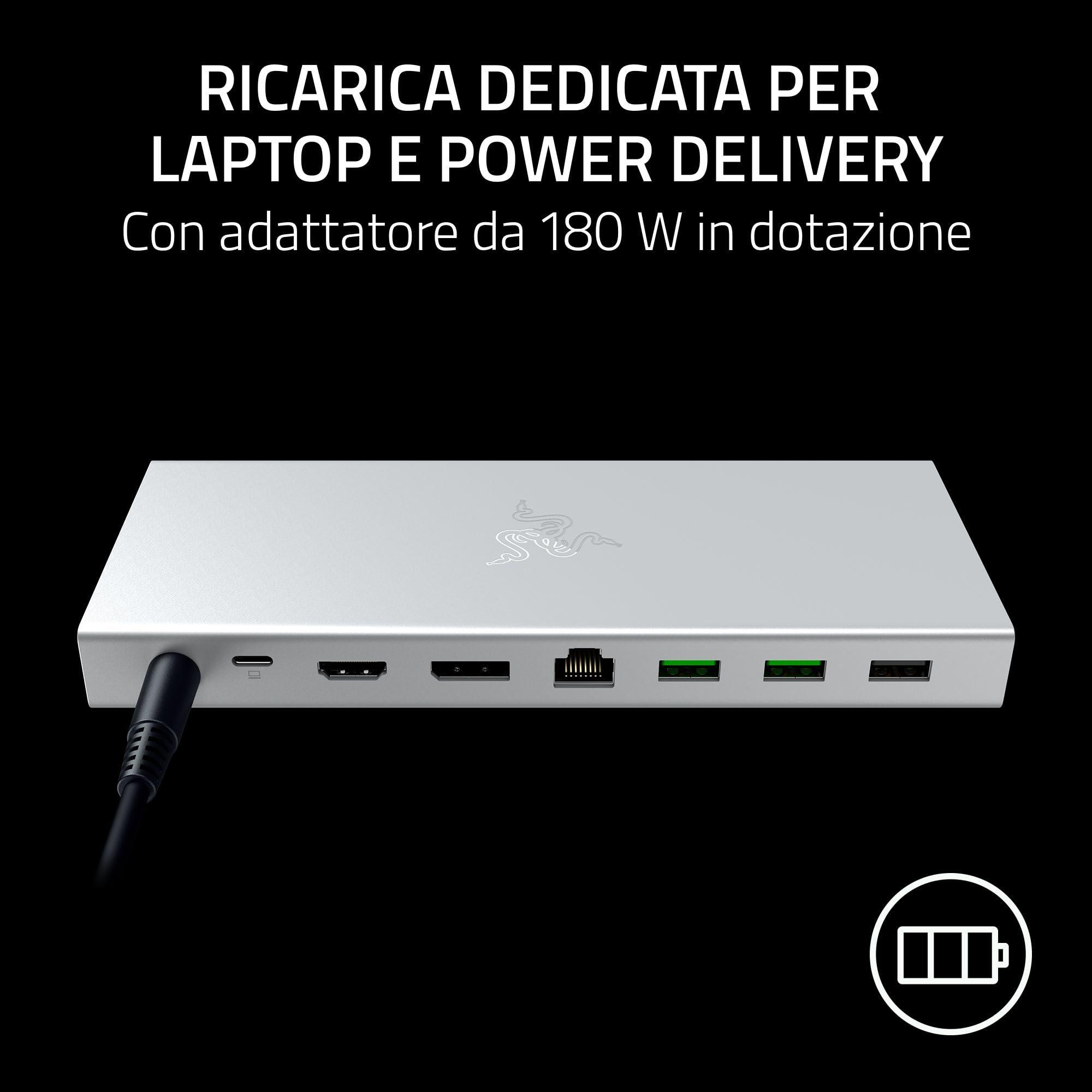 - Ricarica dedicata del laptop e Power Delivery - con adattatore da 180 W incluso: Con l'adattatore da 180 W incluso, è possibile ricaricare il laptop per 100 W e contemporaneamente alimentare tutti gli altri dispositivi collegati, per essere sempre pronti all'uso.