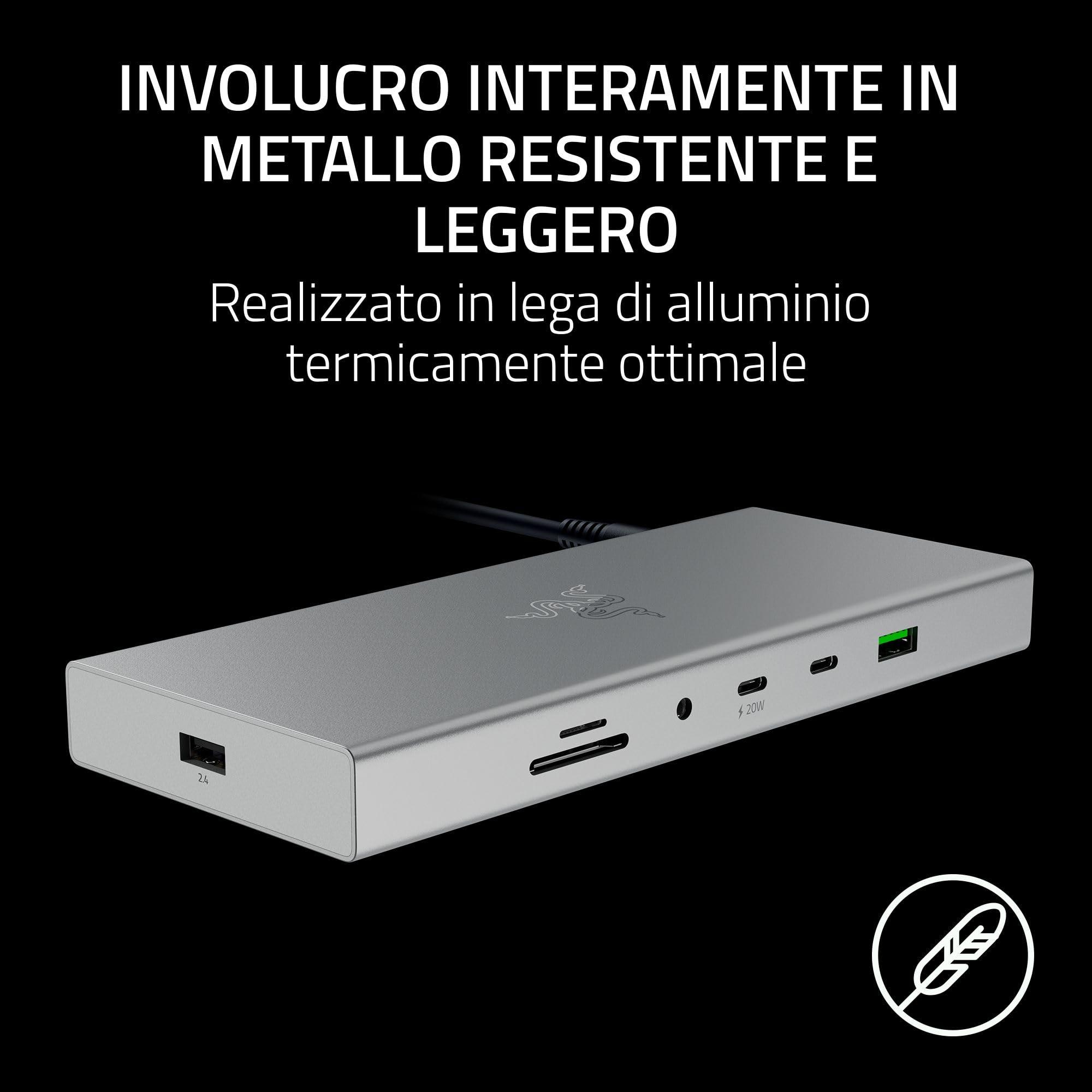 - Involucro interamente metallico, resistente e leggero: realizzato in lega di alluminio termicamente ottimale: Oltre all'ingombro ridotto e al design portatile, il Razer USB 4 Dock è resistente all'usura quotidiana e garantisce un accumulo di calore minimo, rendendolo ideale per un uso prolungato.