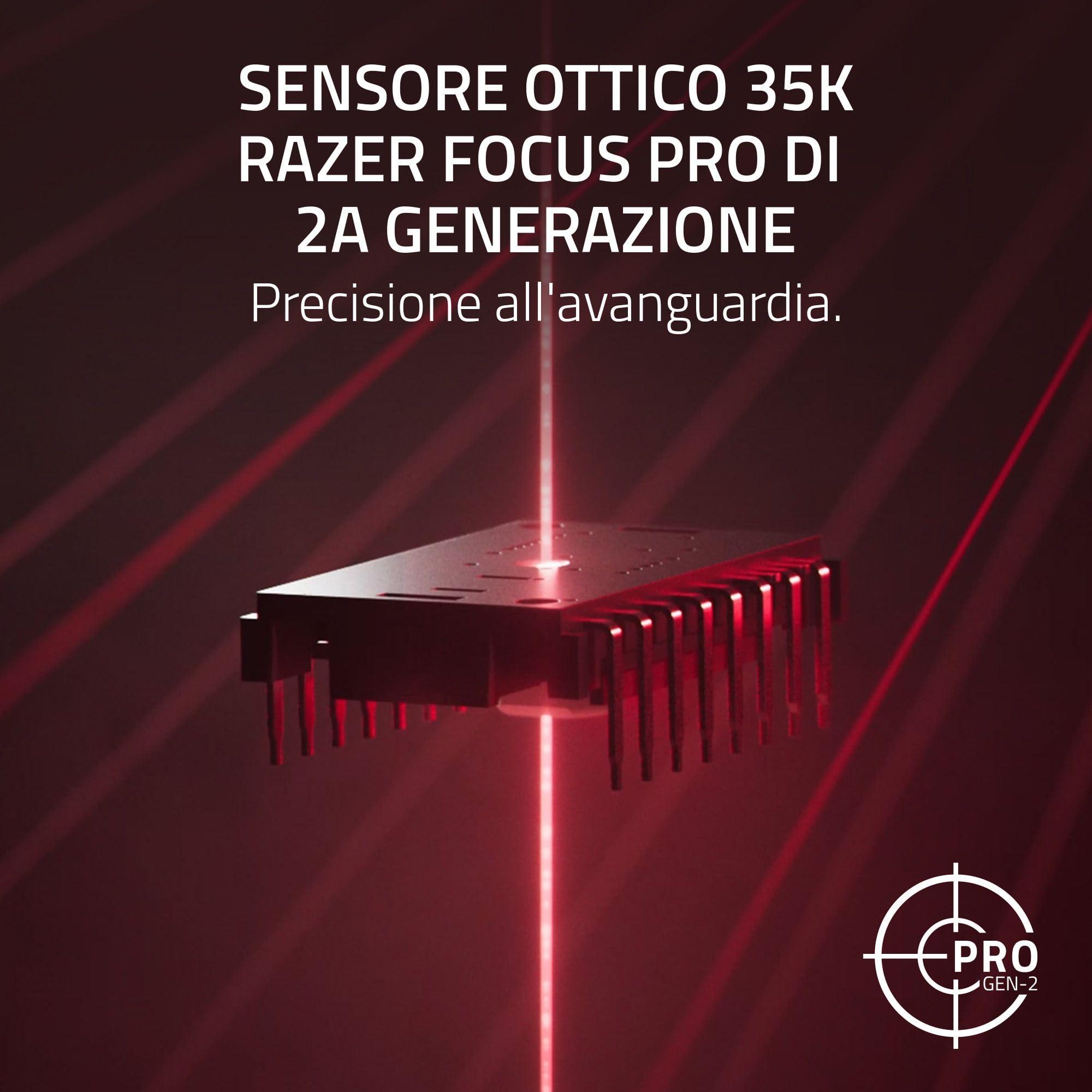 - Sensore ottico Razer Focus Pro 35K DPI Gen-2 - La migliore precisione della categoria: Prestazioni di tracciamento di livello professionale su un'ampia varietà di superfici, compreso il vetro, con il supporto di funzioni intelligenti e regolazioni a passi di 1-DPI per una mira e un controllo più granulari.