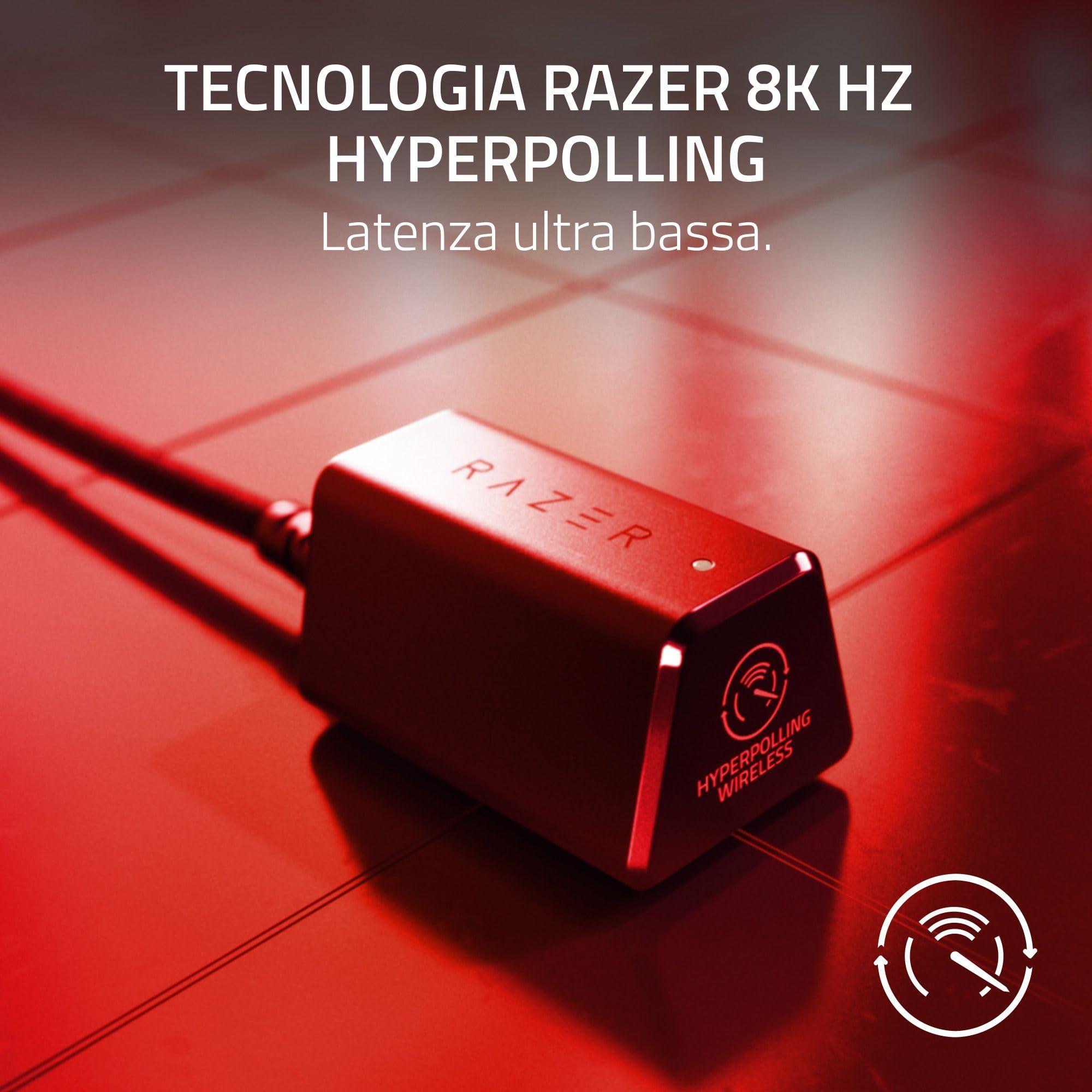 - Tecnologia Razer 8K Hz HyperPolling - Risposta a bassissima latenza: Combinando Razer HyperPolling con la connessione ultra-liscia di Razer HyperSpeed, potrete sperimentare prestazioni wireless impeccabili con una frequenza di polling reale fino a 8000 Hz.