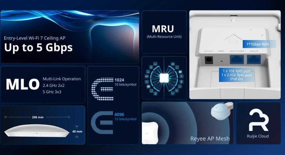 - Prestazioni di nuova generazione con Wi-Fi 7, che offre velocità wireless estremamente elevate Streaming superiore con l'esclusiva funzione MLO di Wi-Fi 7 Design compatto e facile installazione Trasmissione dati migliorata con 4K-QAM per velocità più elevate Ideale per l'integrazione con switch aziendali per creare una solida rete per ufficio