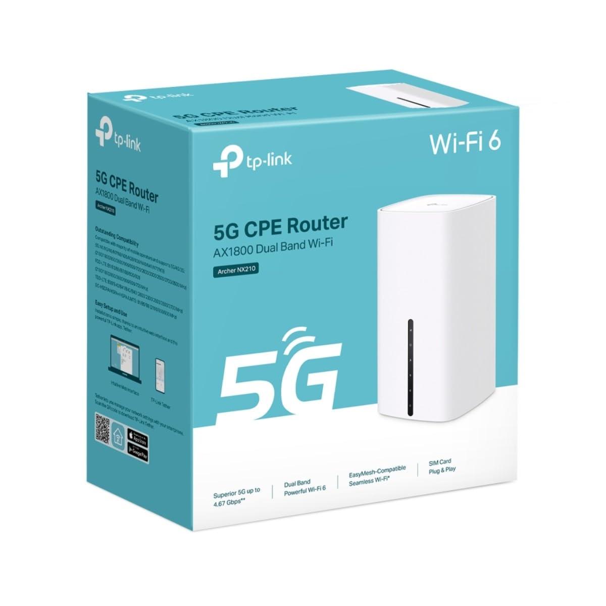 Informazioni sul Router TP-Link Archer NX210 AX1800 Dual-Band Gigabit 5G BiancoUn'Esperienza RivoluzionariaSfrutta la tua rete 5G avanzata con velocità di download fino a 4,67 Gbps. Condividi la tua rete 5G con vari dispositivi Wi-Fi e goditi film Ultra HD senza interruzioni, trasferimenti di file super veloci e videochiamate fluide. Allo stesso tempo, il NX210 è retrocompatibile con la modalità 4G.Condividi la Velocità 5G con Wi-Fi AffidabileGrazie alla tecnologia 5G all'avanguardia, il NX210 raggiunge velocità di download fino a 4,67 Gbps, soddisfacendo le esigenze di tutti i tuoi dispositivi. Dotato di tecnologia Wi-Fi 6, il NX210 è progettato per offrire un notevole aumento della copertura, della velocità e della capacità complessiva. Entra nella più recente rete mesh Wi-Fi e goditi il futuro di Internet: più veloce, più stabile e in grado di connettere più dispositivi.Semplice - basta una SIMInstallare la banda larga tradizionale o via cavo può essere costoso e richiedere tempo per una casa vacanze, una fattoria o un magazzino nei sobborghi. Anche i contratti a lungo termine sono un problema per gli affitti a breve termine, gli spazi temporanei o i negozi pop-up che necessitano di accesso a Internet. Archer NX210 ti garantisce un'installazione rapida e senza complicazioni. Devi solo inserire la tua SIM e iniziare a godere di Internet ad alta velocità!Crea Facilmente una Rete Mesh in Tutta la CasaSe hai zone senza copertura in casa, basta aggiungere un altro router o extender compatibile con EasyMesh per creare una rete mesh multi-gigabit in tutta la casa. In questo modo, non dovrai più cercare un punto con connessione stabile.Disponibile Connessione WAN di BackupLa porta Gigabit WAN/LAN consente al NX210 di funzionare come un router wireless tradizionale, compatibile con modem via cavo, fibra ottica o DSL. E quando lo usi come router wireless, la tua connessione 5G/LTE funge da backup, garantendoti una connessione Internet continua e affidabile.Configurazione