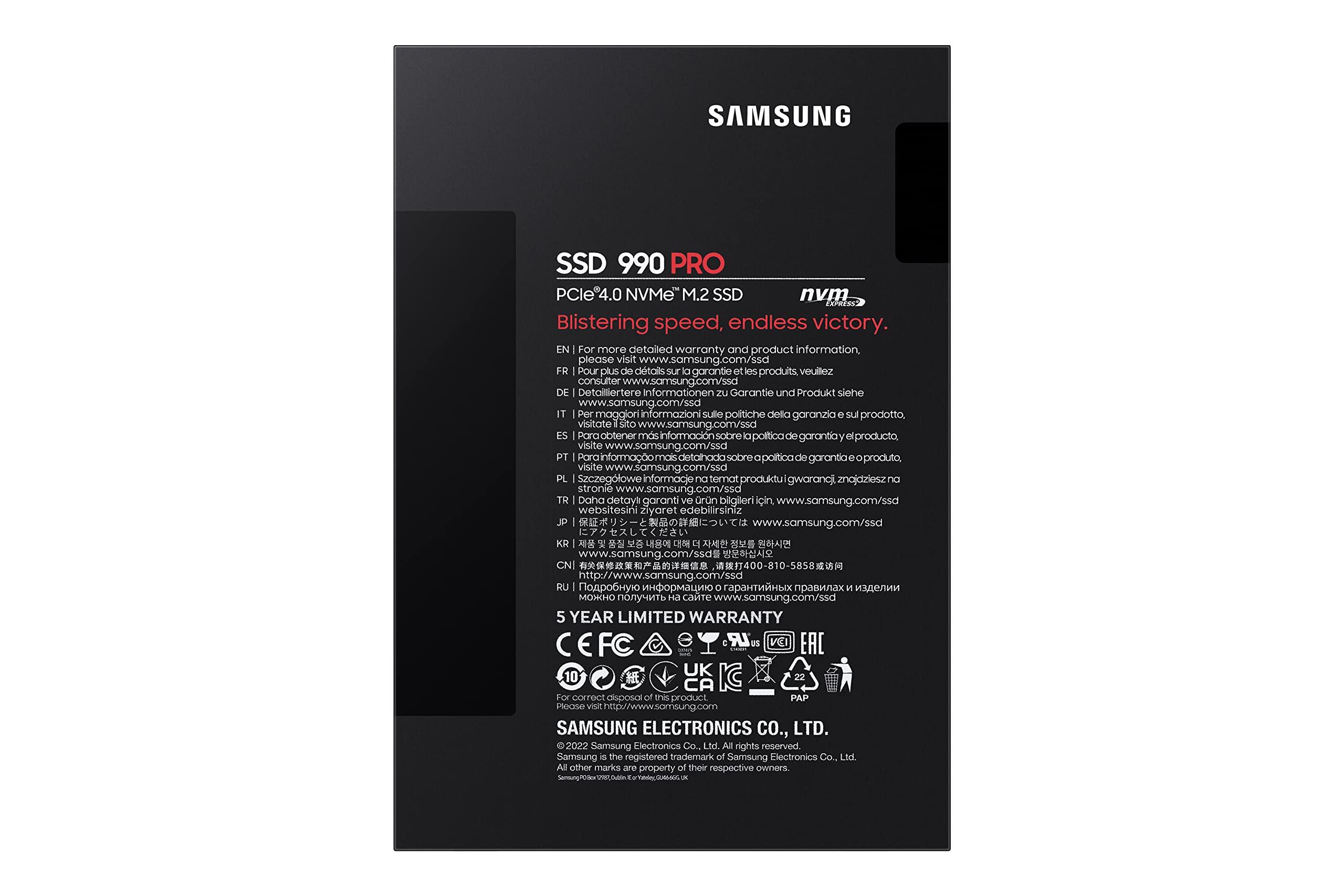 Samsung 990 PRO NVMe M.2 SSD, 1TB, PCIe 4.0, 7.450 MB/s in lettura, 6.900 MB/s in scrittura, SSD interno per giochi ed editing video, Nero, MZ-V9P1T0BW