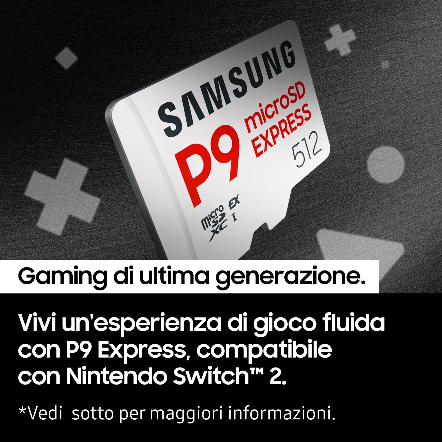 - RIDEFINISCI LA TUA ESPERIENZA DI GIOCO: potenzia la tua Nintendo Switch 2! La scheda micro SD Samsung P9 Express offre tempi di caricamento rapidissimi da 800 MB/s e un gameplay fluido per un divertimento senza limiti.