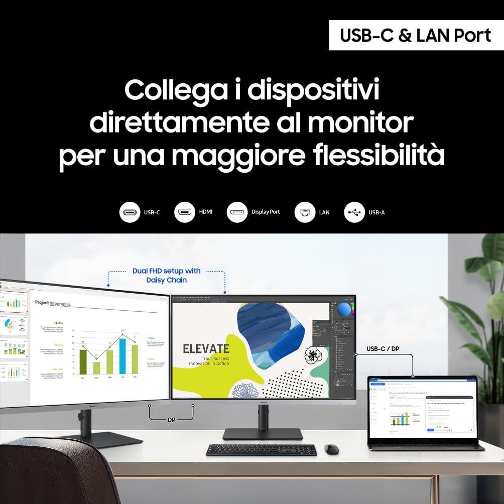 - Contenuto: 1x Samsung Monitor S43UF 24", Include cavo di alimentazione, cavo HDMI e cavo USB Type-C, Dimensioni con base (LxAxP): 53,99 x 51,89 x 21,97 cm