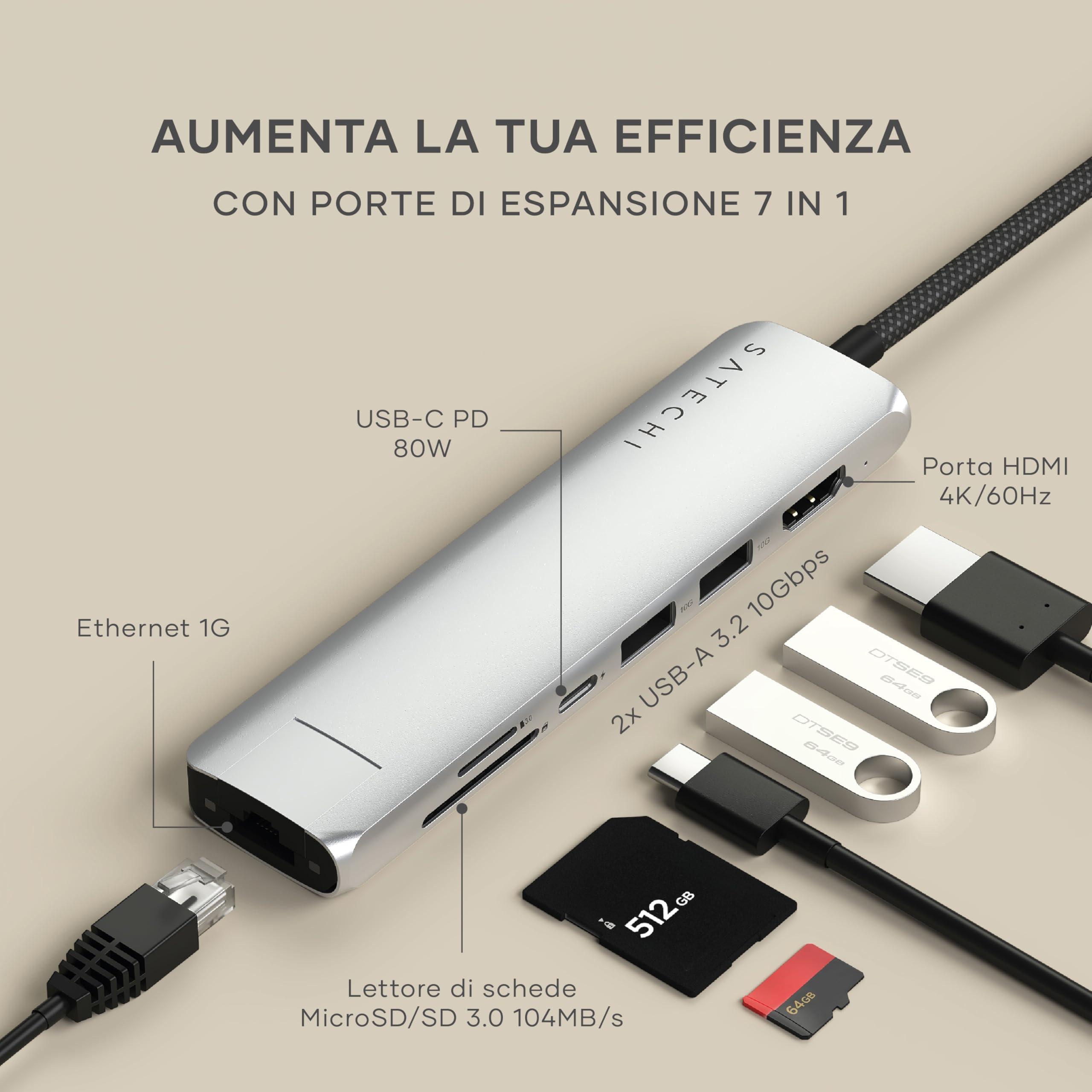 SATECHI 7 in 1 USB C Hub Slim Plus, HDMI 4K a 60Hz, PD da 100W, 2x Porte USB-A, Ethernet, SD/MicroSD – per MacBook Air e Pro, iPad, iPhone, Windows, Surface, ThinkPad, Chromebook e altro – Argento