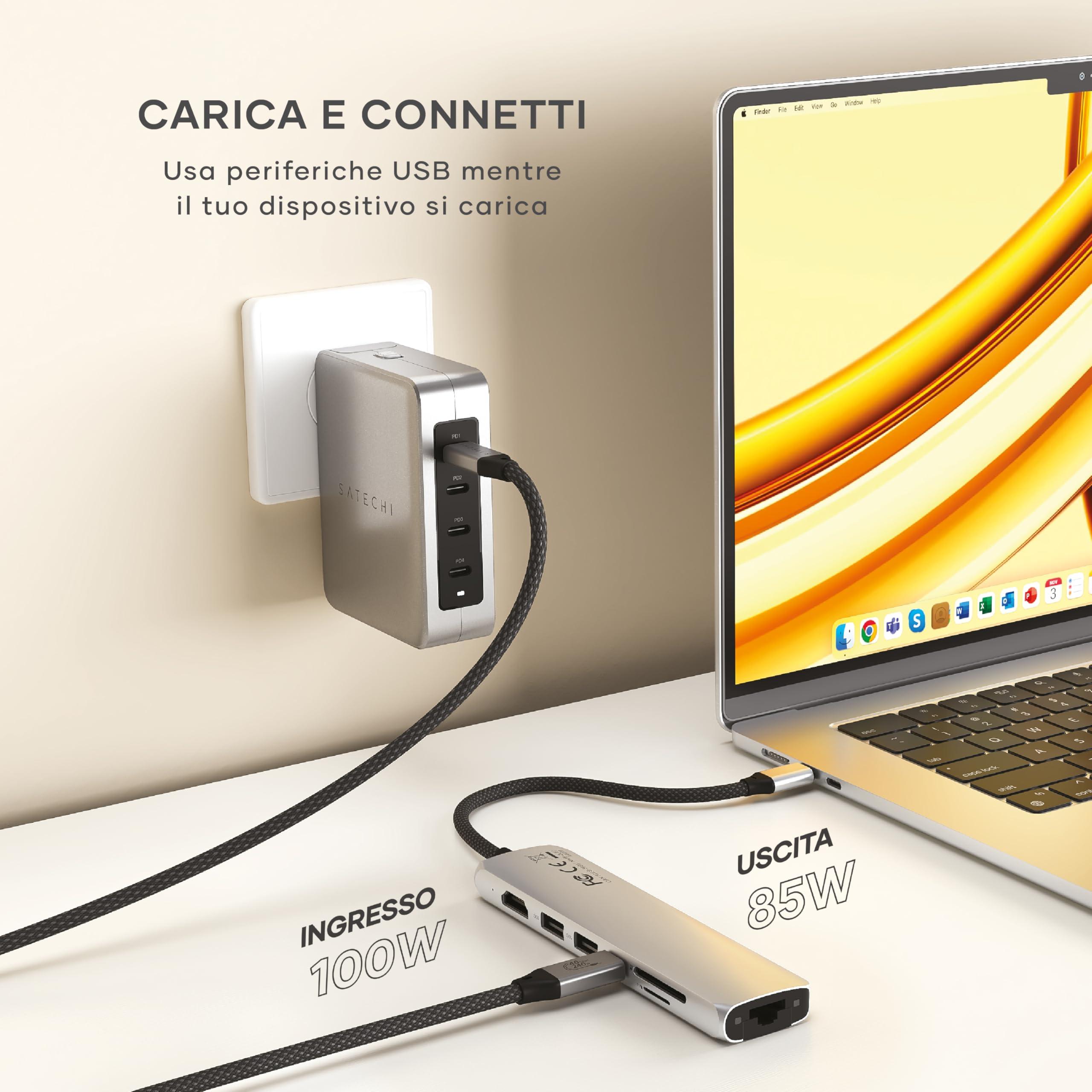 La porta USB-C PD supporta 100 W in ingresso e circa 80 W in uscita per alimentare il notebook anche mentre usi l’hub.