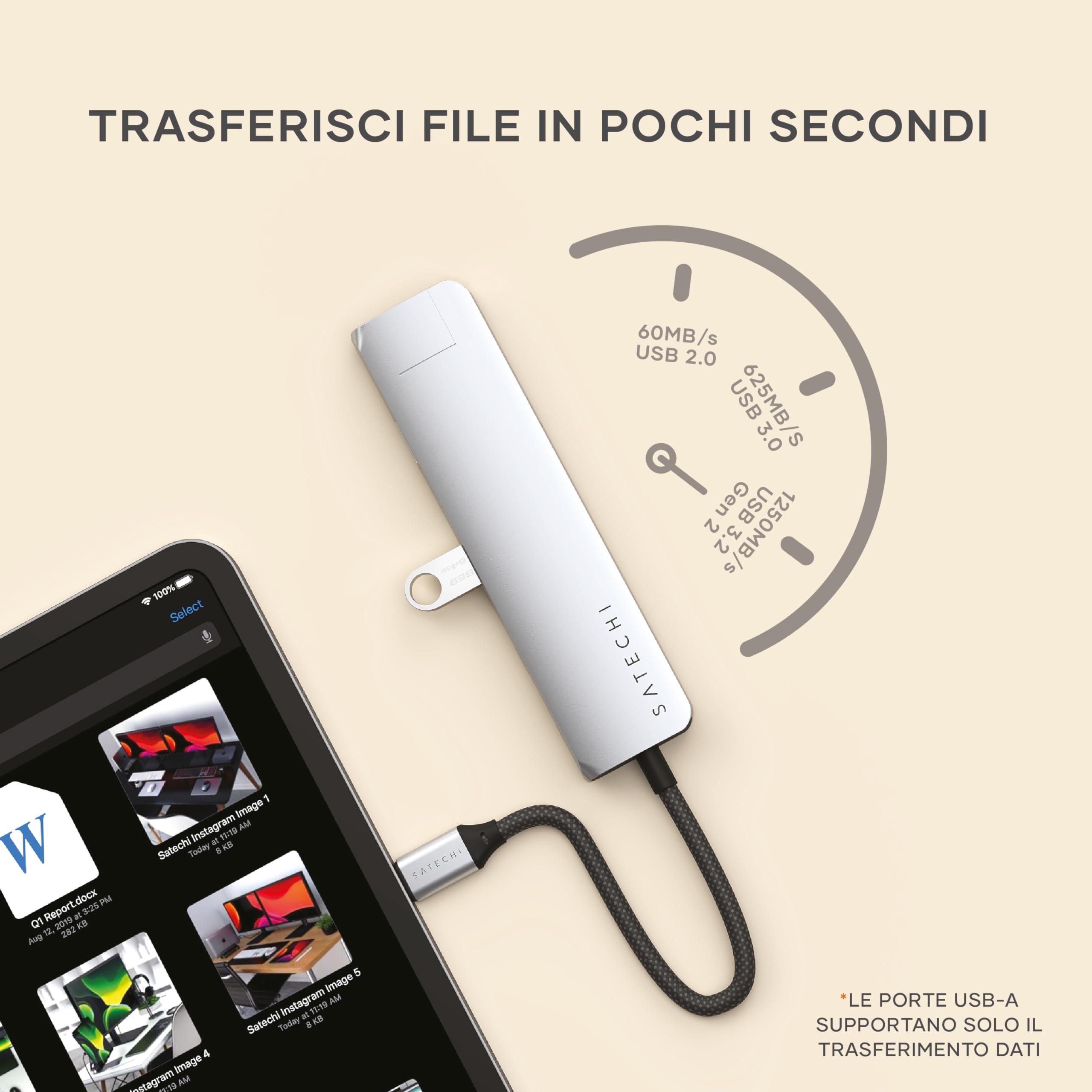 - TRASFERIMENTI ULTRA RAPIDI – Sposta i file in un istante con il nostro hub USB-C SATECHI, dotato di due porte USB-A 3.2 Gen 2 (10 Gbps), in grado di trasferire 3.000 immagini JPEG in appena 1 minuto. Utilizza chip Parade Technologies per maggiore sicurezza. Temperatura operativa: 30–50 °C.