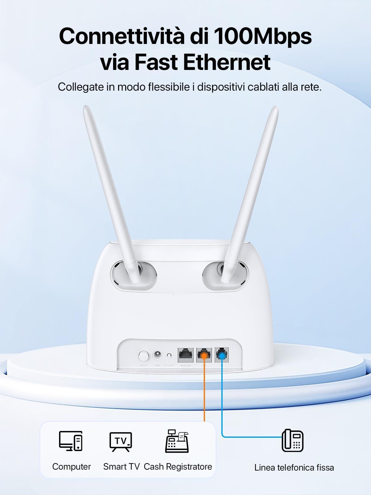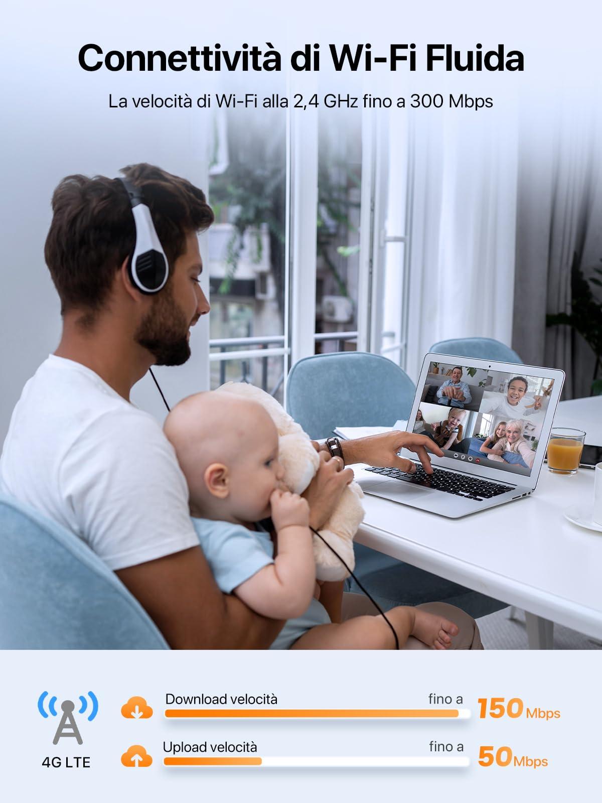 - [Connessione 4G Veloce] Migliorato rispetto ai precedenti modelli 4G, questo modem router WiFi permette velocità 4G LTE fino a 150 Mbps e Wi-Fi da 300 Mbps su banda 2.4 GHz per una connessione stabile.