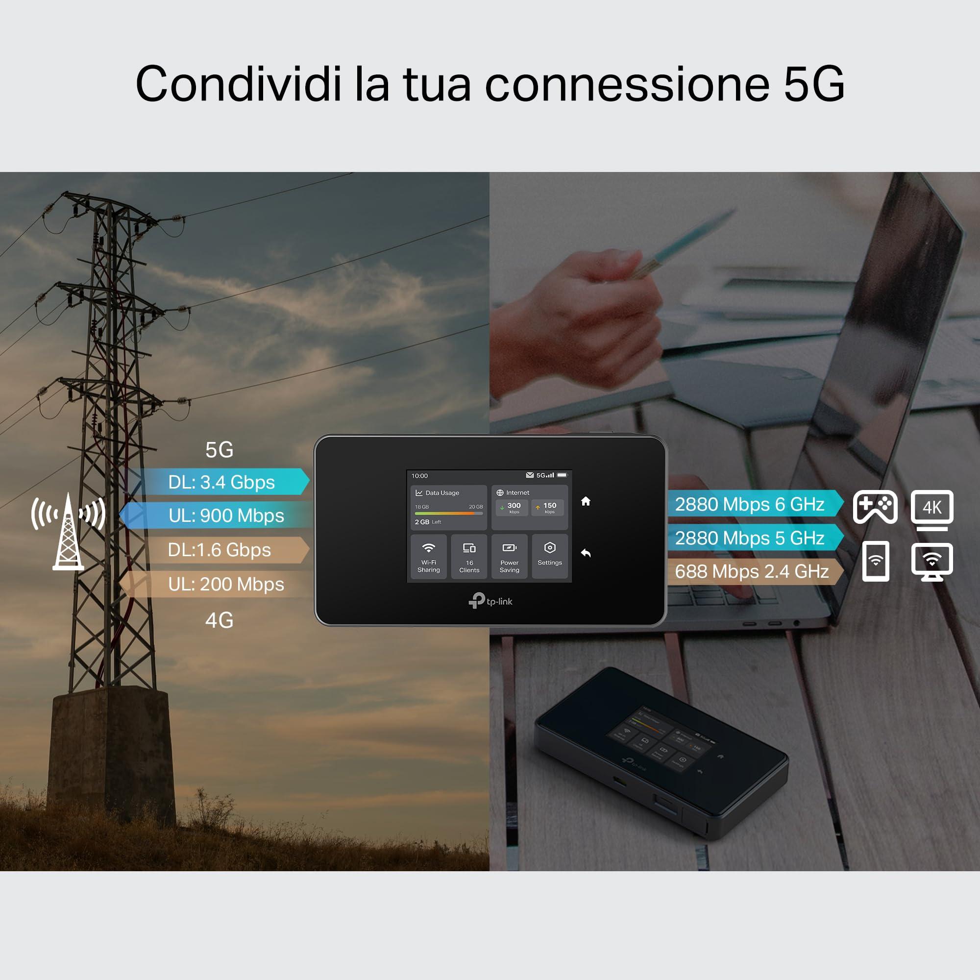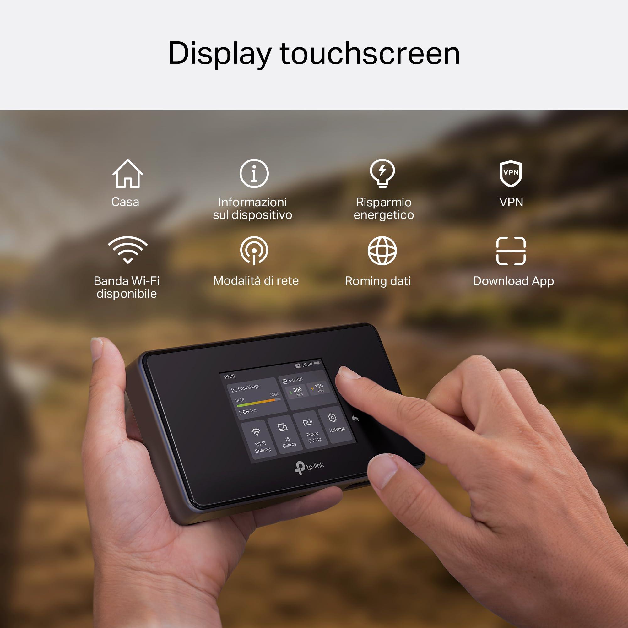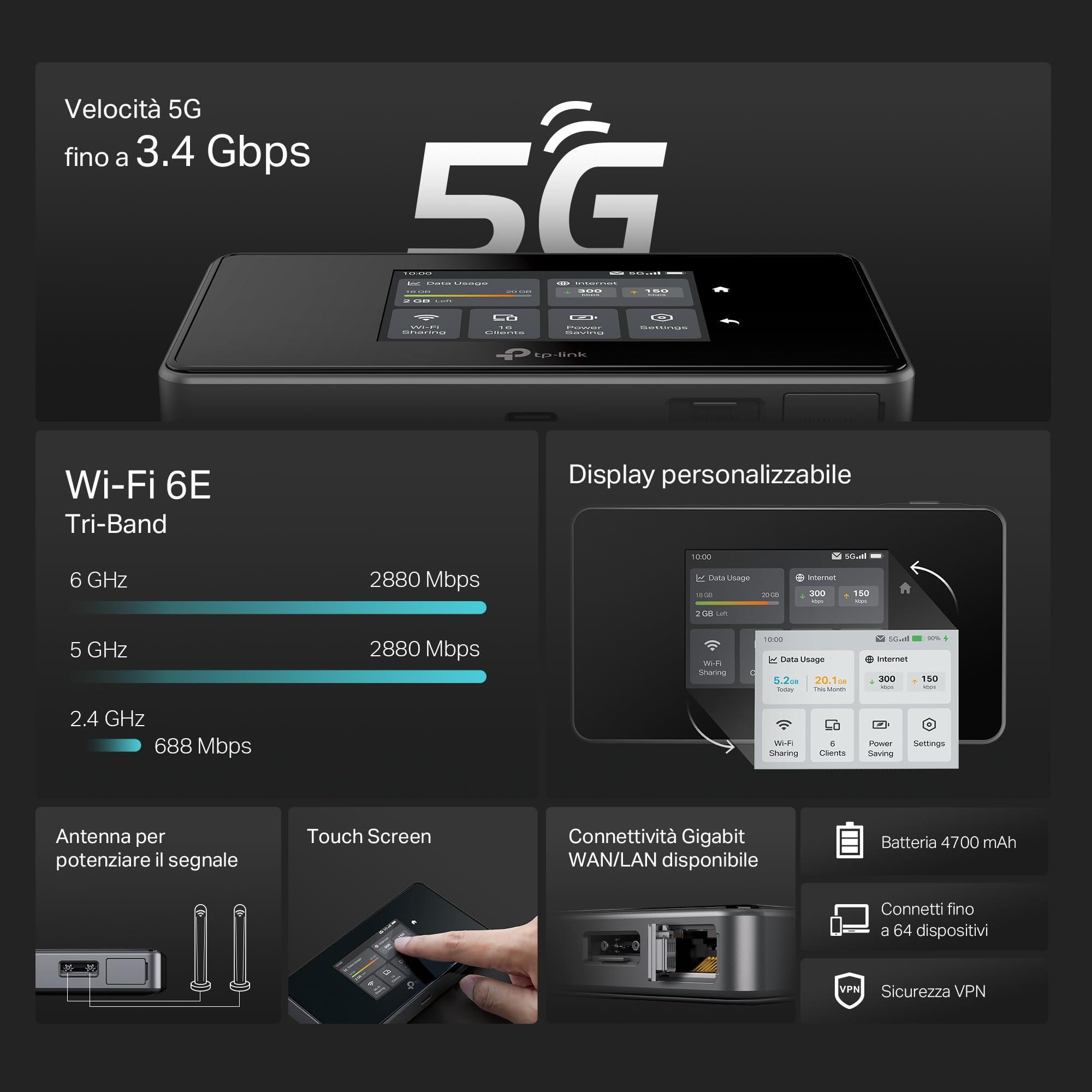 TP-Link M8550 Saponetta WiFi 5G, Router 5G, WiFi 6E AXE3600Mbps Tri-Band, DL 3400Mbps/UL 900Mbps, Batteria da 4700mAh, Porta WAN/LAN Gigabit, Touchscreen, Supporta fino a 32 Dispositivi, VPN Wireguard