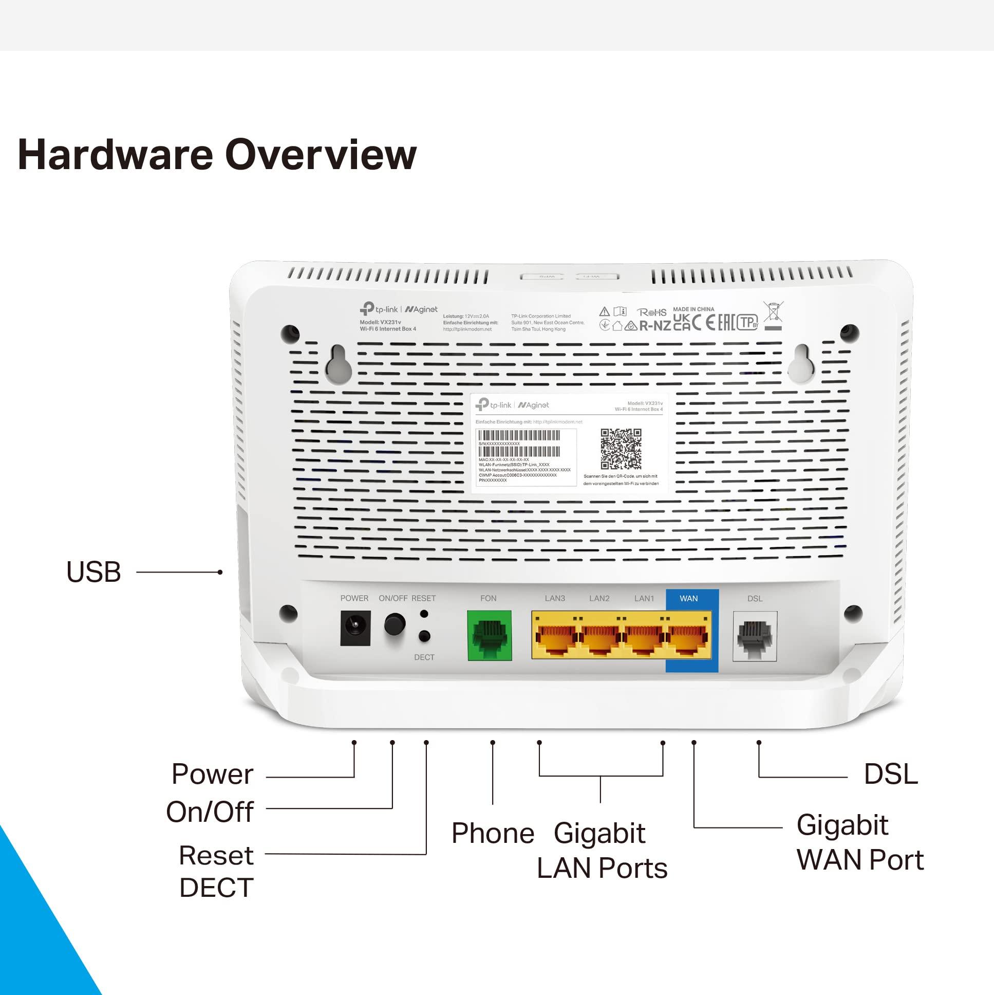 TP-Link VX231v Wi-Fi 6 VDSL Modem Router, VDSL2 35b 300 Mbit/s, 4 porte Gigabit, AX1800 Dual Band WLAN, supporta Telekom, O2, 1&1, non Vodafone MIC, solo per Germania
