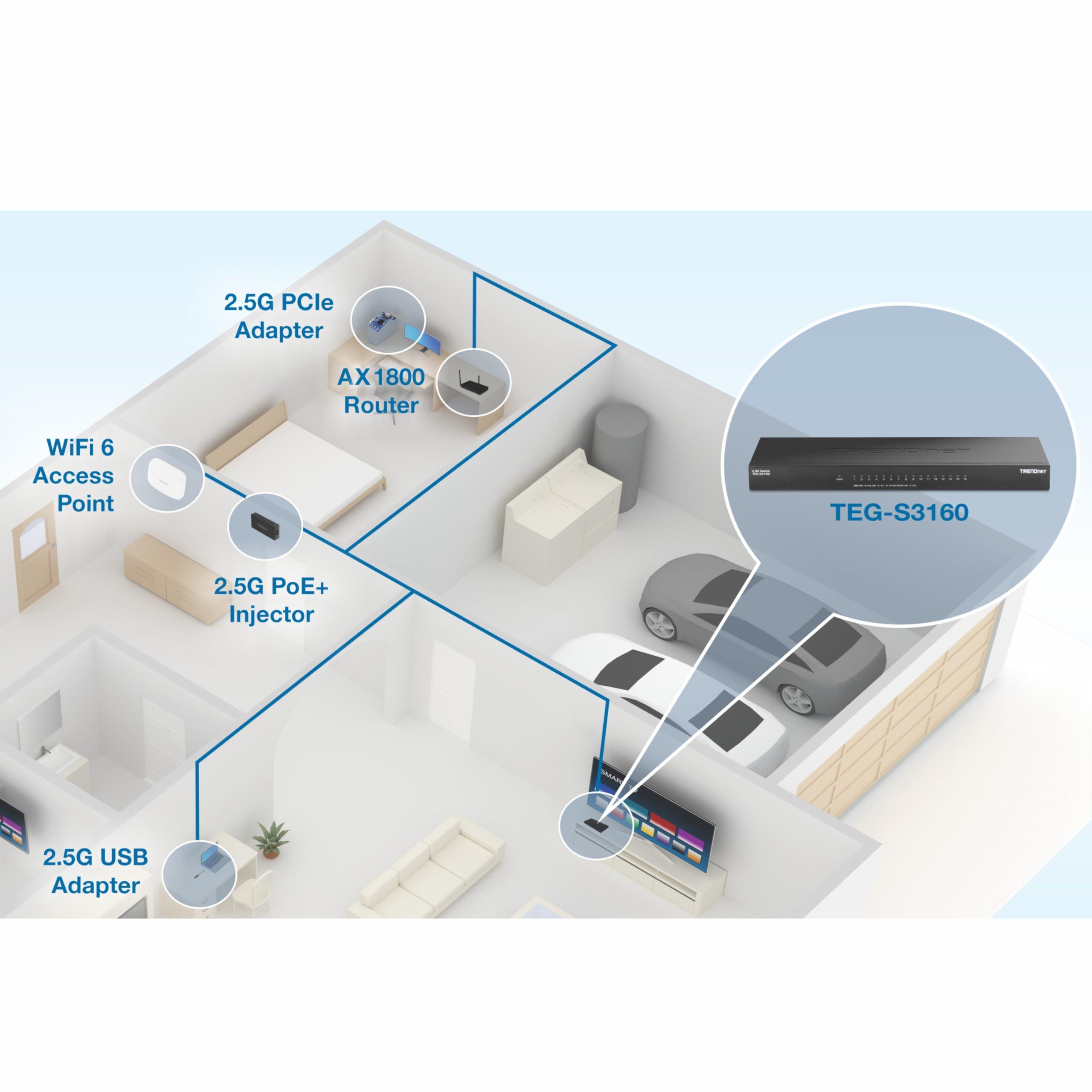TRENDnet Switch Ethernet di rete desktop 2,5G non gestito a 16 porte, TEG-S3160, 16 porte RJ-45 da 2,5 Gb, capacità di switching di 80 Gbps, conforme NDAA TAA, protezione a vita, Nero