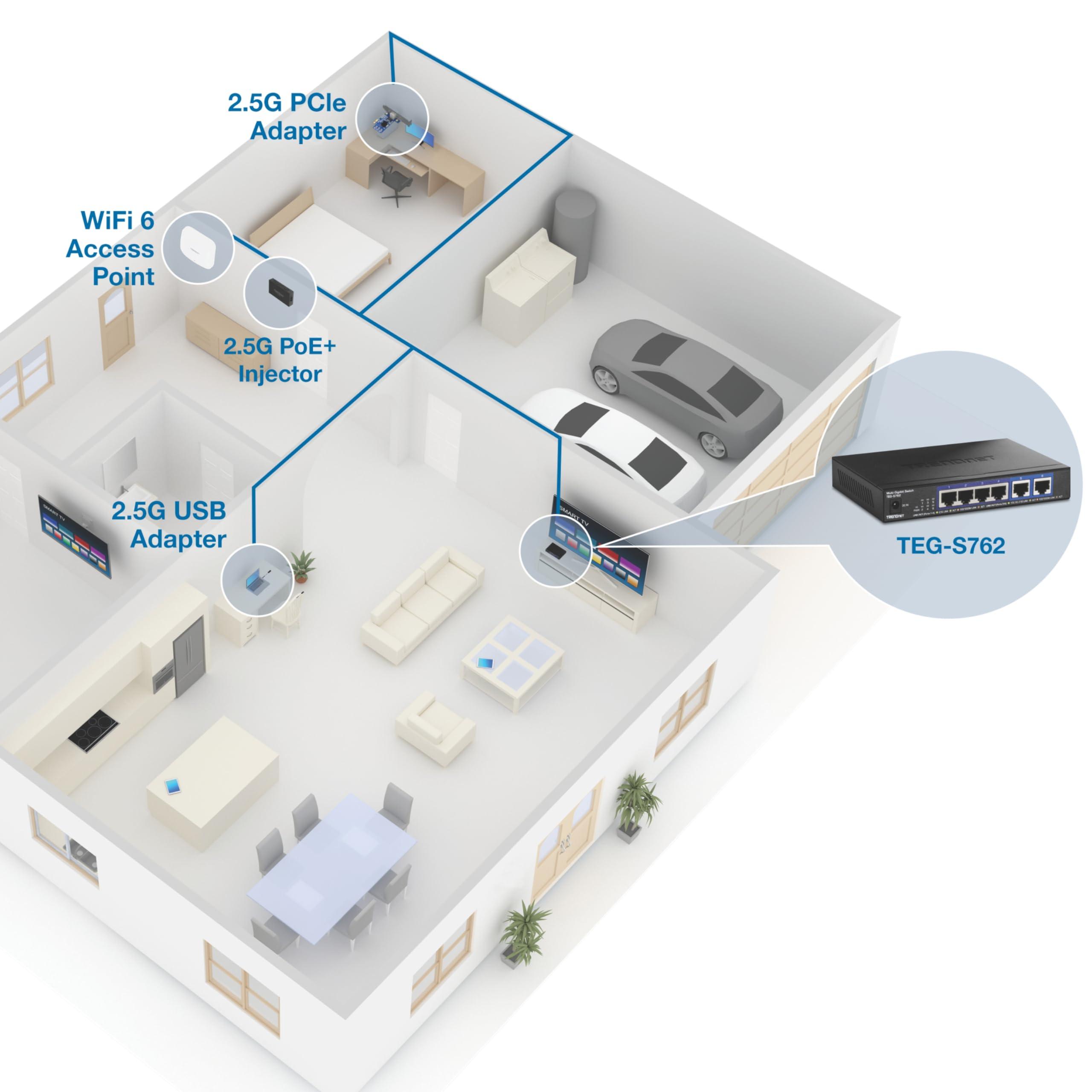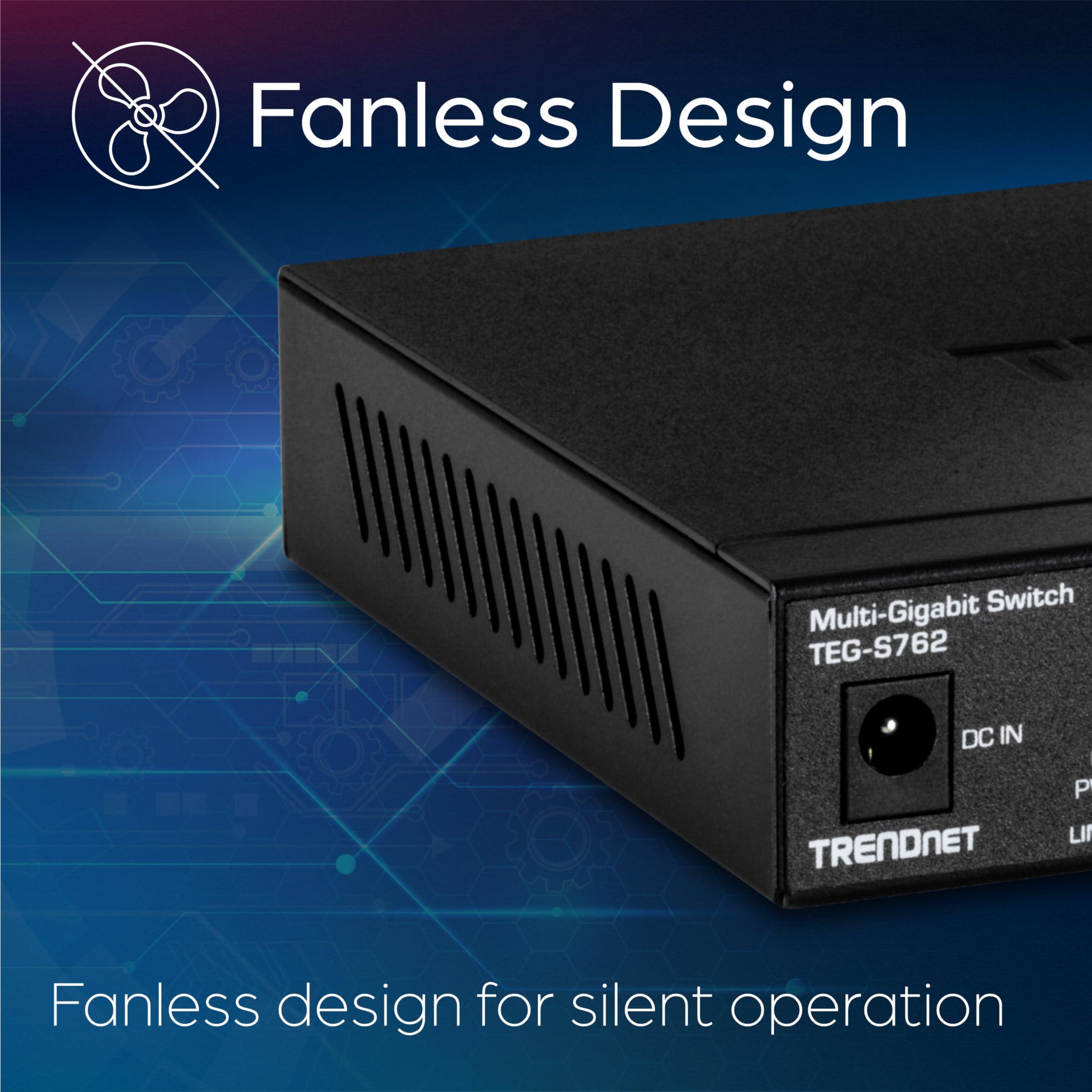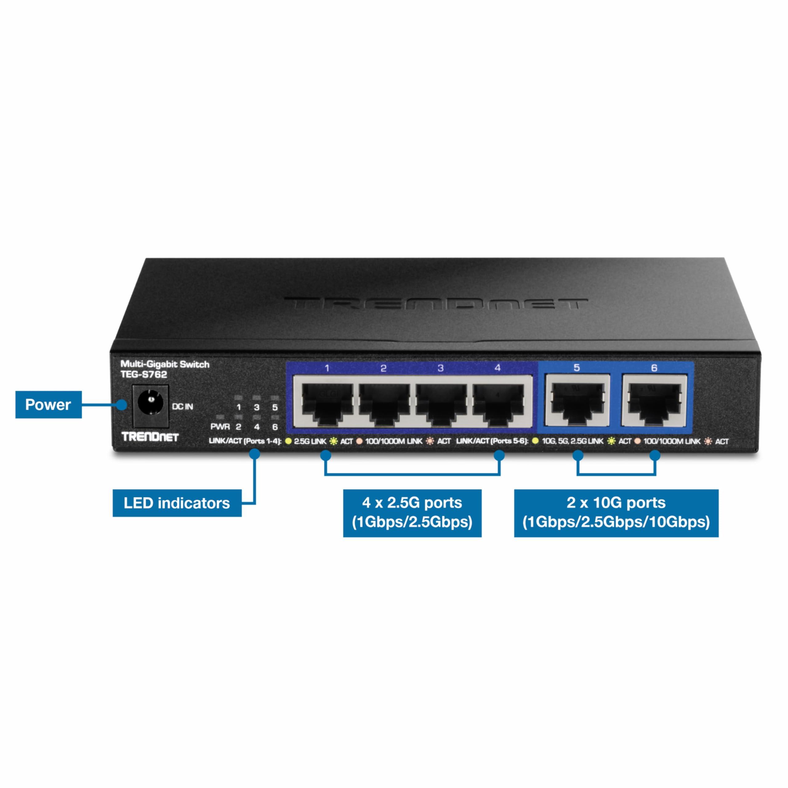 TRENDnet TEG-S762 Switch 6 porte 10G, 4 porte RJ-45 Base-T da 2,5 G, 2 porte RJ-45 10G, capacità di commutazione 60 Gbps, montabile a parete, connessioni di rete 10 Gigabit, nero