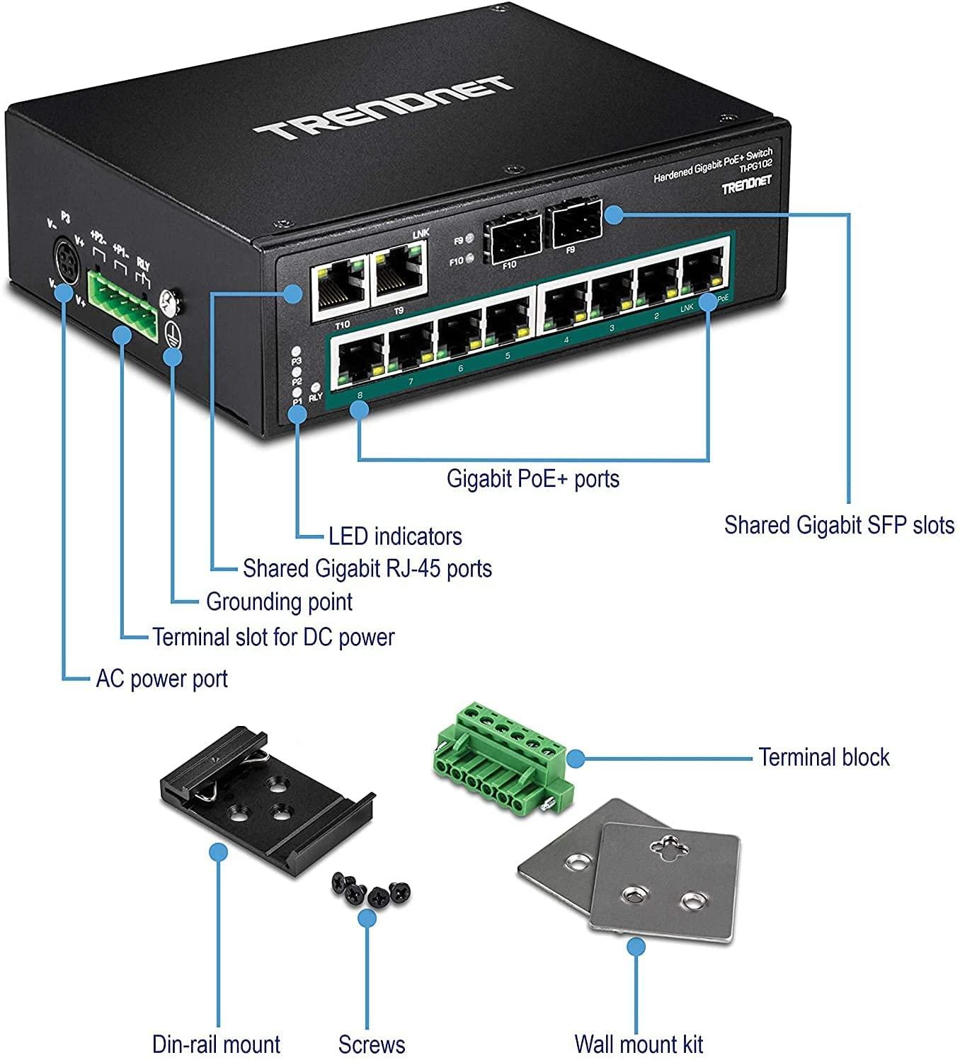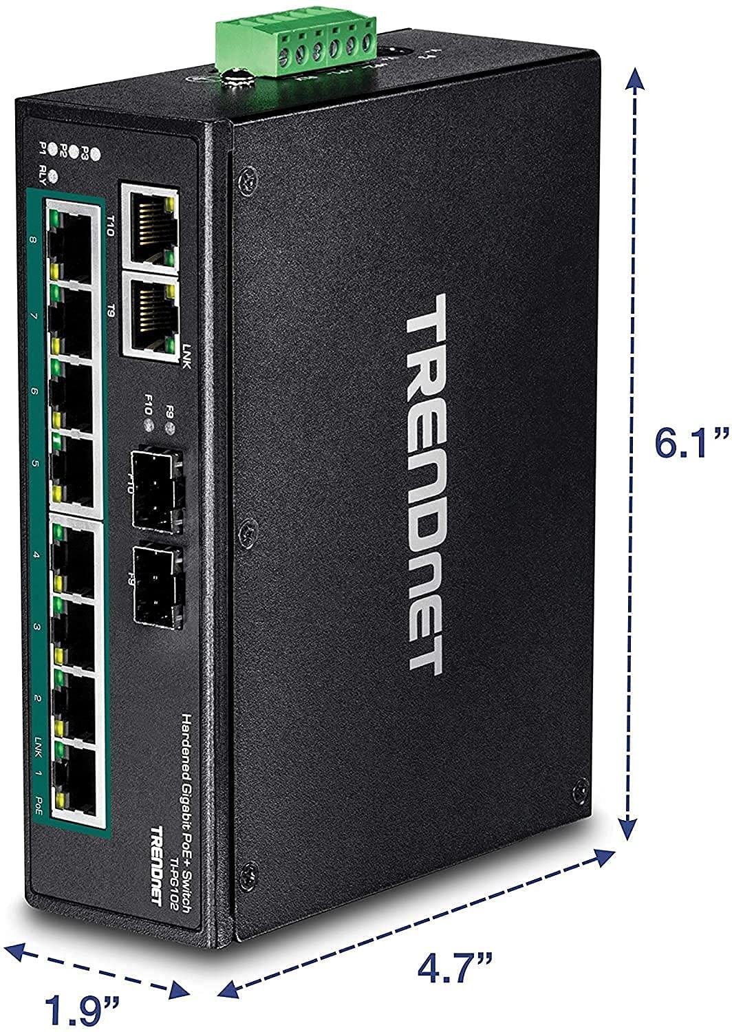 TRENDnet, TI-PG102, Switch industriale Gigabit PoE+ DIN-Rail a 10 porte, 8 porte Gigabit PoE+, 2 slot SFP, budget di potenza PoE da 240 W