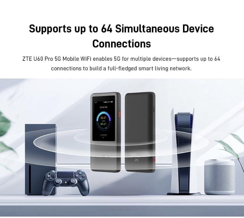 - Supporto multi-dispositivo: collega fino a 64 dispositivi contemporaneamente su frequenze dual-band (2,4 GHz e 5 GHz) con ottimizzazione automatica che ti connette al WiFi più veloce, sia che tu stia lavorando in remoto o viaggi internazionali, il ZTE U60 ti ha coperto