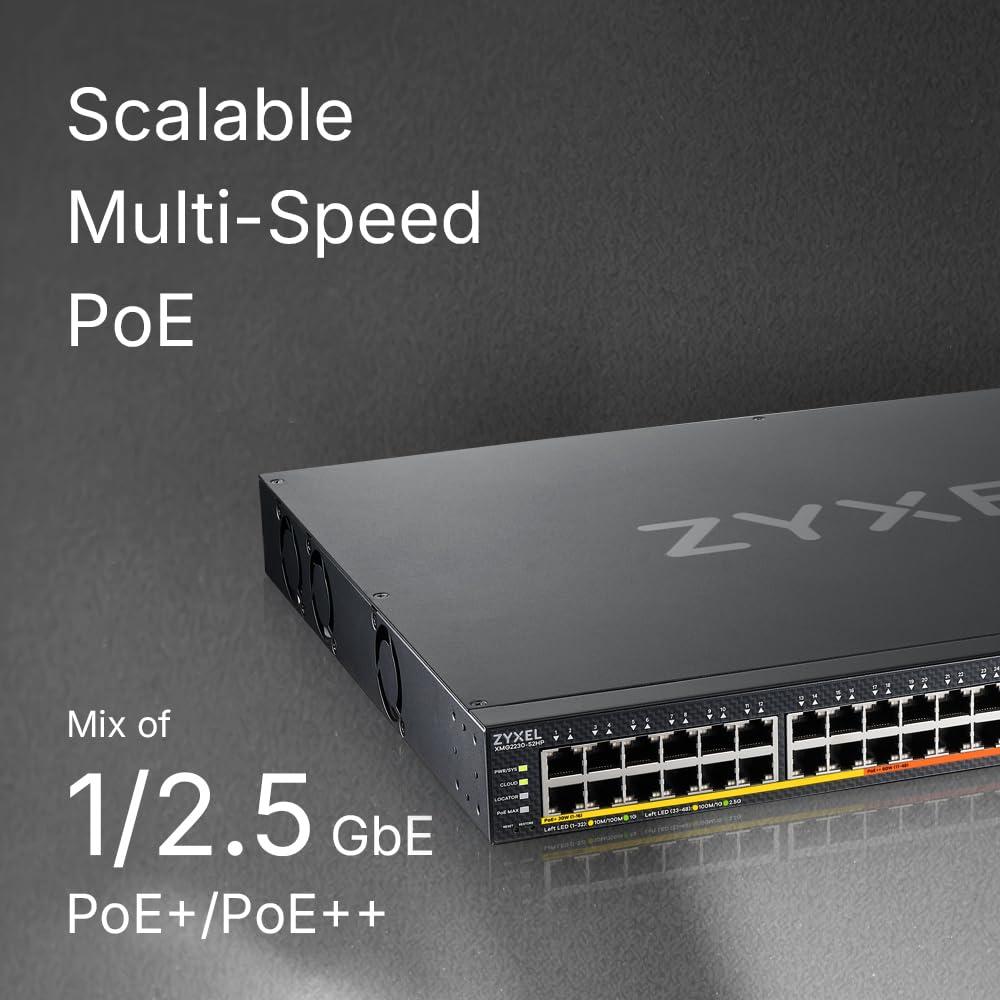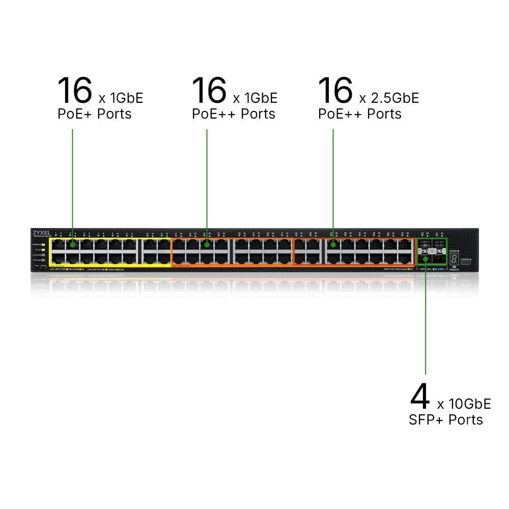 Zyxel Switch PoE a 52 porte | 16 x 2,5 GbE, 32 x 1 GbE PoE++, 4 x 10 G SFP+ | Switch ad accesso multi-Gig-L3 gestito cloud | Doppia alimentazione AC 960 W/DC 2400 W [XMG2230-52HP]