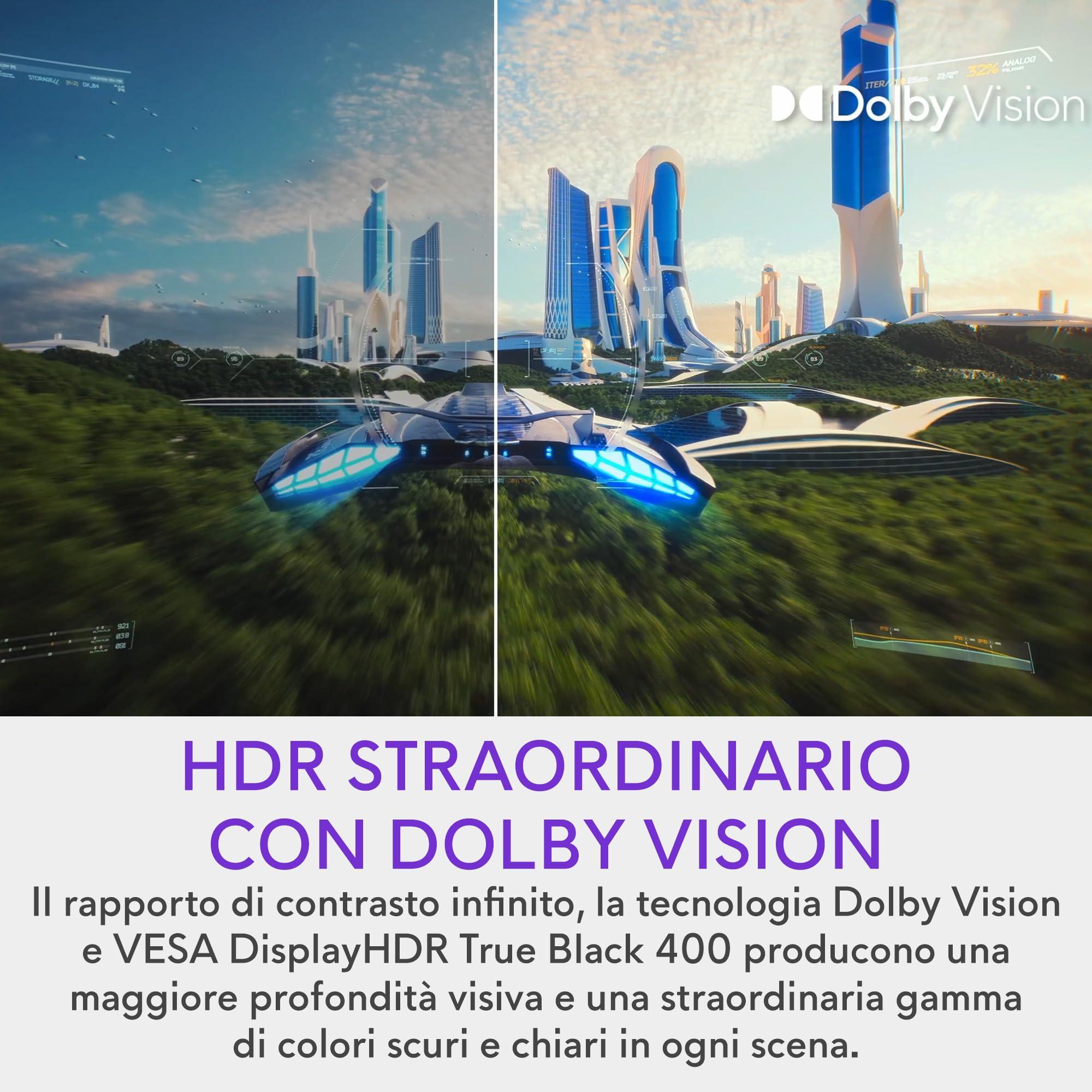 - HDR impressionante con Dolby Vision: un rapporto d'aspetto infinito, Dolby Vision e VESA DisplayHDR True Black 400 offrono una maggiore profondità visiva e una straordinaria gamma di colori da scuri a chiari in ogni scena.