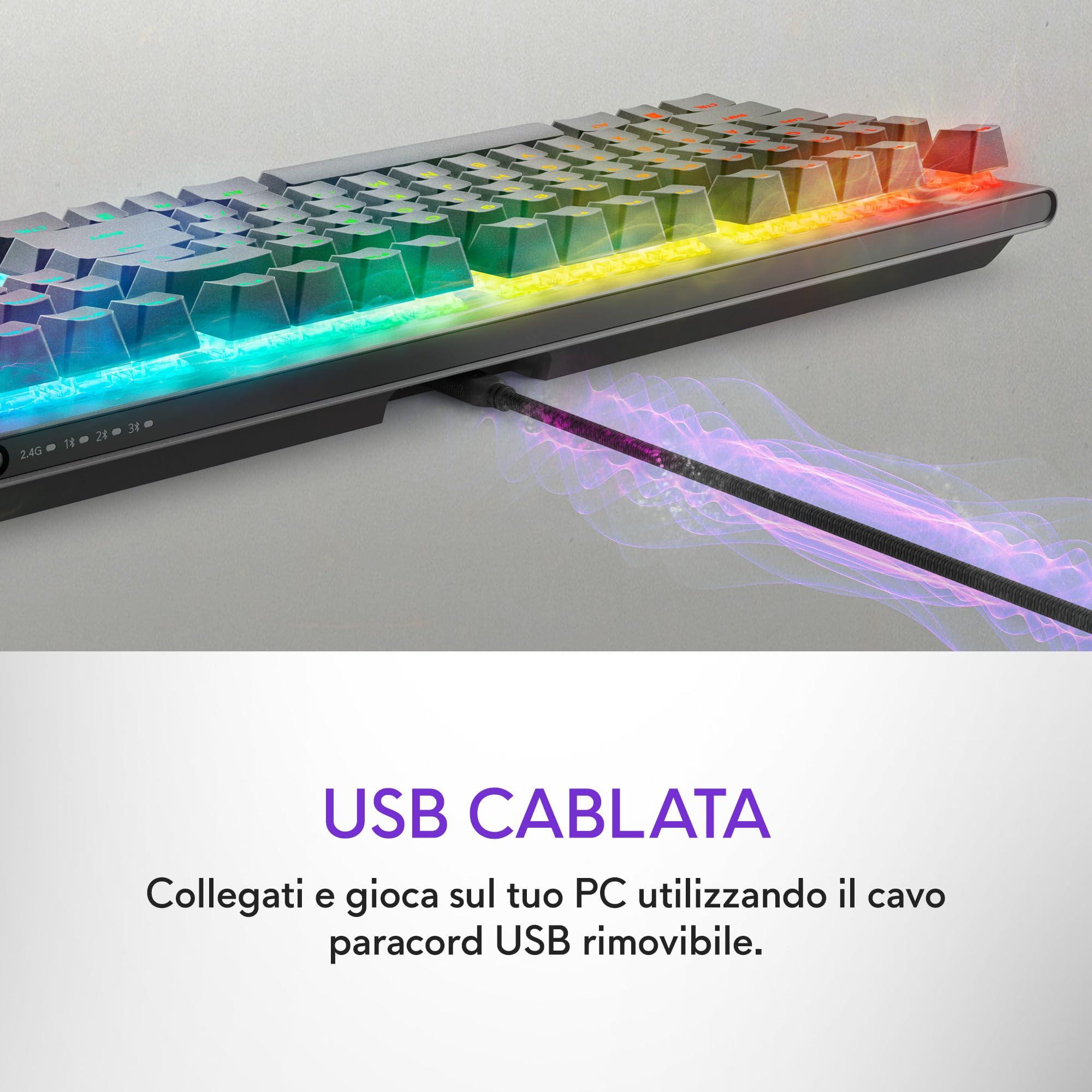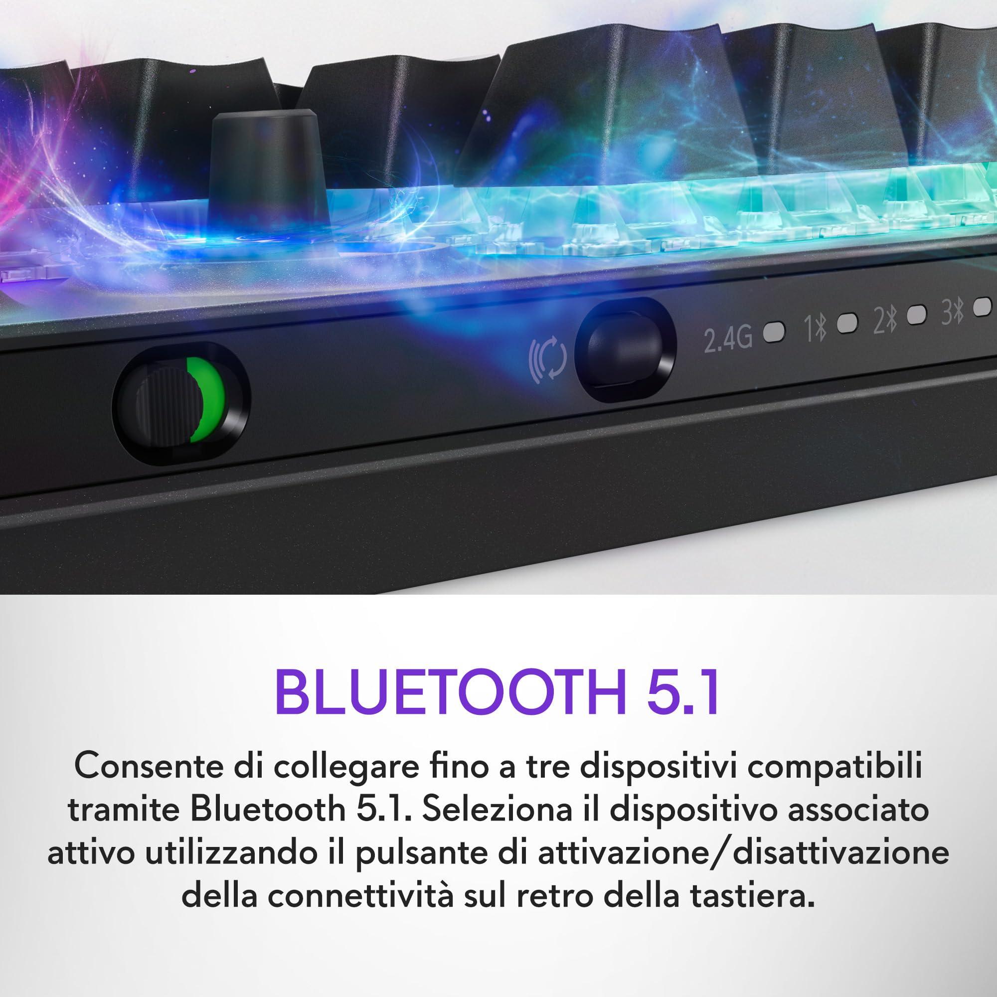 - CONNETTIVITÀ TRI-MODE FLESSIBILE: Collega la tastiera in modalità wireless a 2,4 GHz per prestazioni reattive su PC, utilizza il Bluetooth 5.1 per connettere fino a tre dispositivi o sfrutta la modalità cablata con il cavo USB rimovibile.